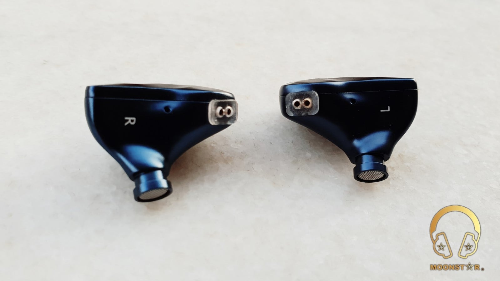 On the back part of each monitor shell is a 2 pin (0.78mm) female connector and one bass vent.