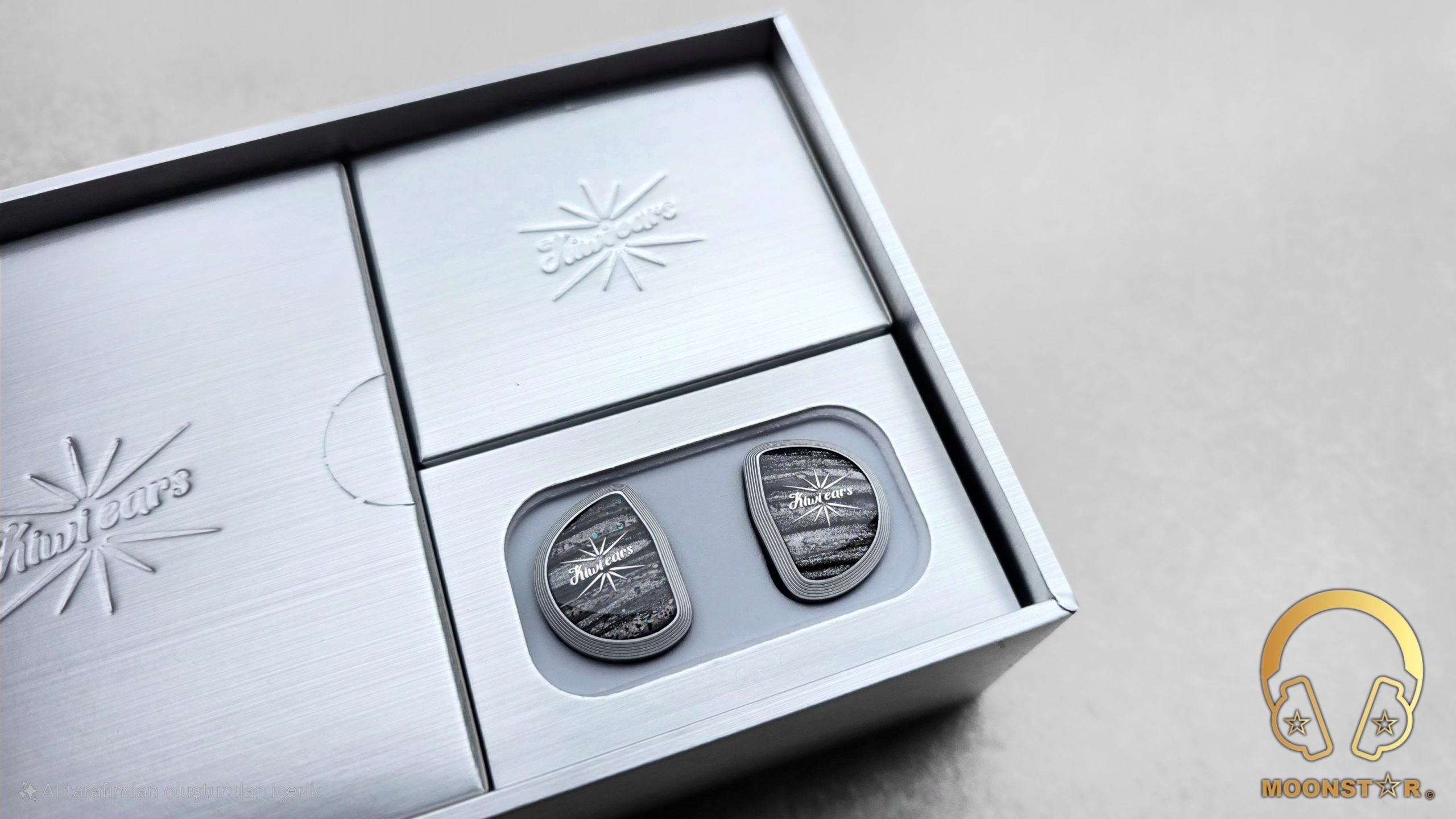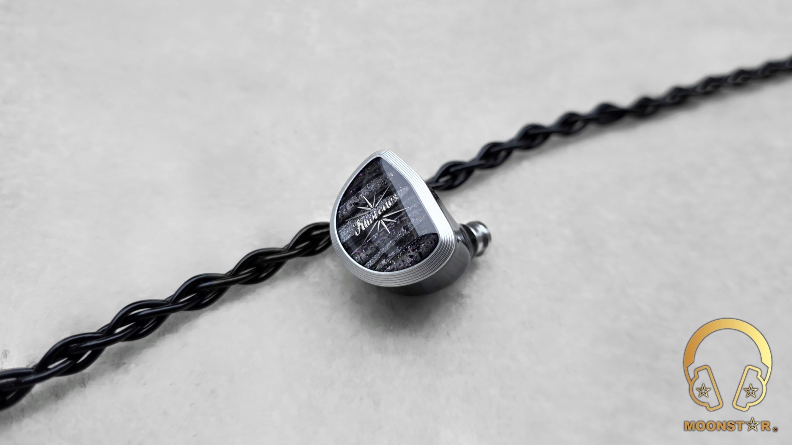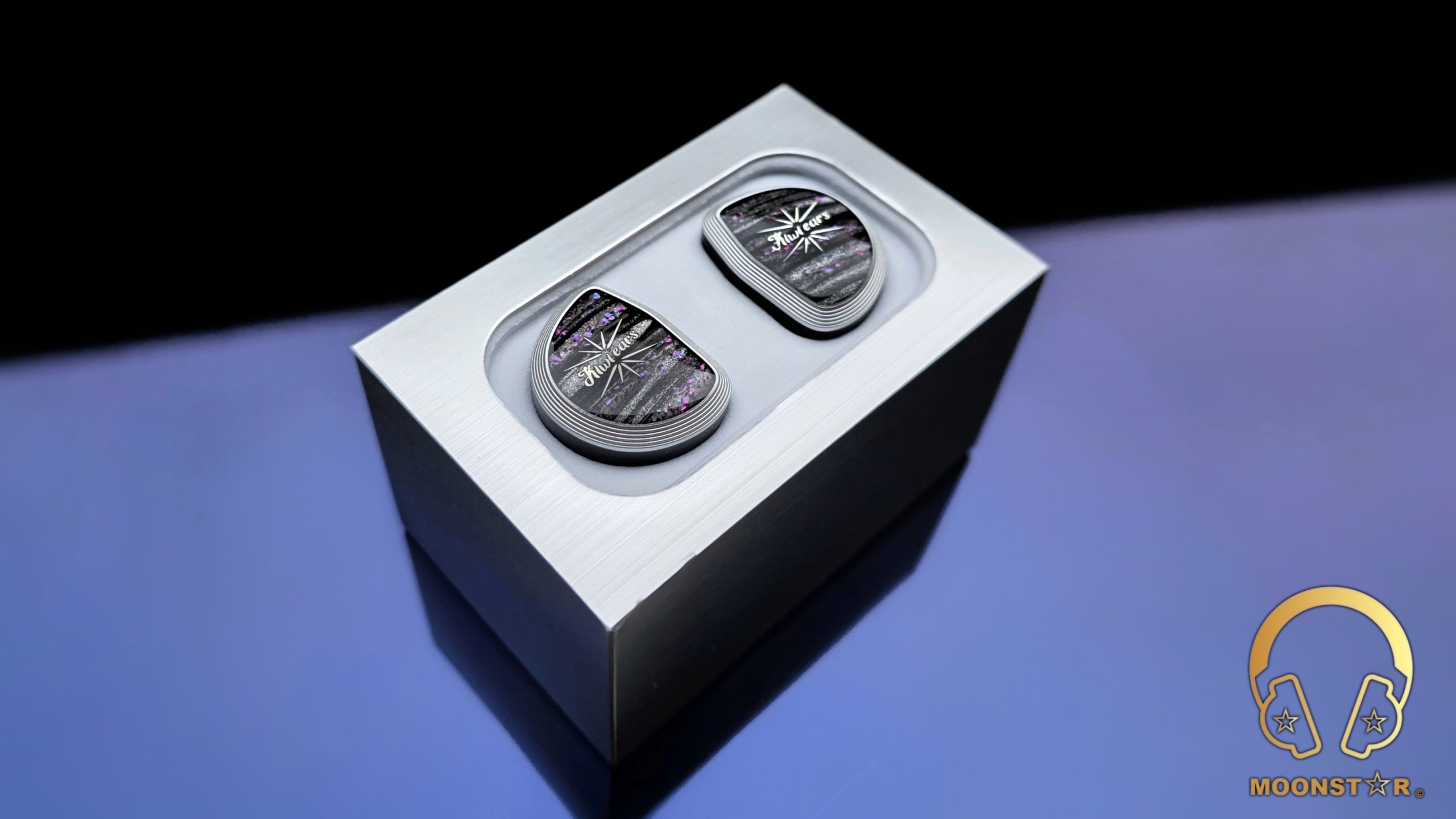 The Kiwi Ears Aether has a design that feels both premium and purposeful. The shells are crafted from medical-grade resin, delivering a solid yet lightweight build. The faceplates are a visual highlight, featuring a striking black and white marbled pattern with a subtle shimmer of purple and pink flecks, reminiscent of a starry night sky. This marbled effect is accented by a bold starburst graphic at the center, with the “Kiwi Ears” branding elegantly scripted in white, adding a touch of sophistication.