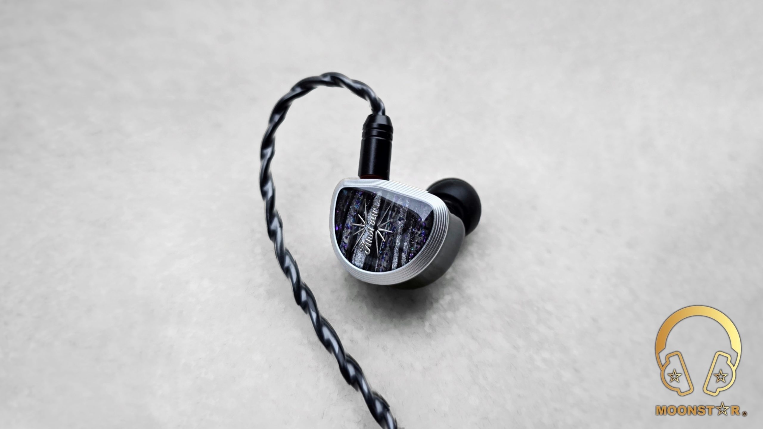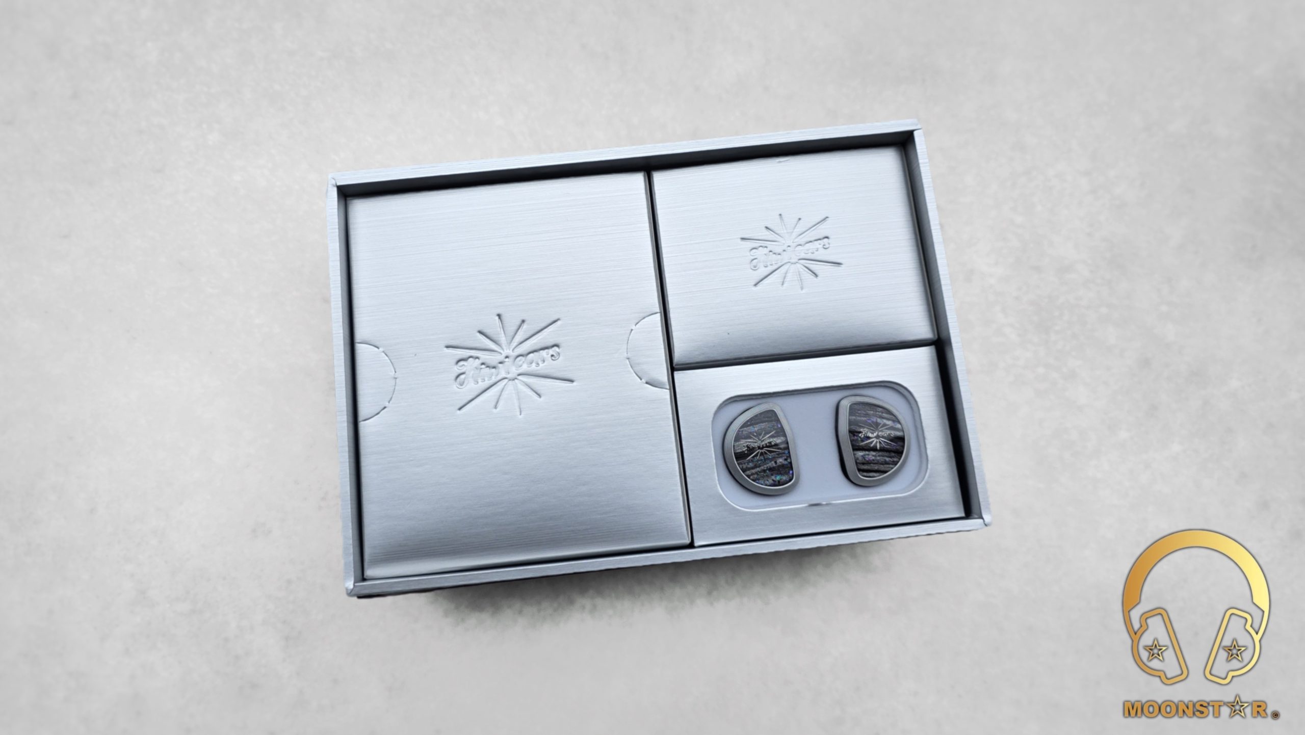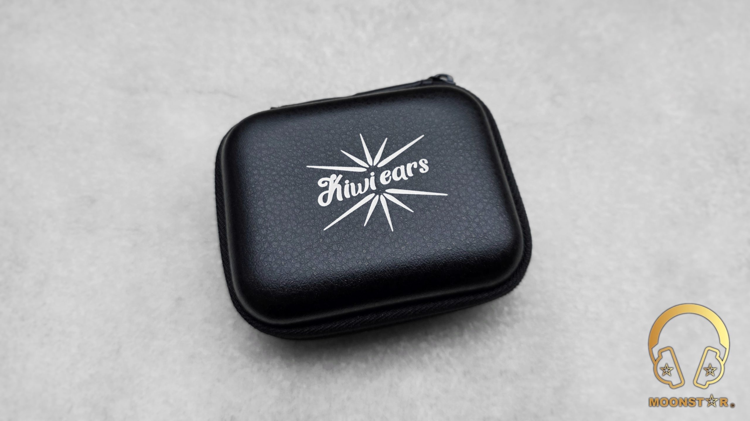 The Kiwi Ears Aether has a design that feels both premium and purposeful. The shells are crafted from medical-grade resin, delivering a solid yet lightweight build. The faceplates are a visual highlight, featuring a striking black and white marbled pattern with a subtle shimmer of purple and pink flecks, reminiscent of a starry night sky. This marbled effect is accented by a bold starburst graphic at the center, with the “Kiwi Ears” branding elegantly scripted in white, adding a touch of sophistication.