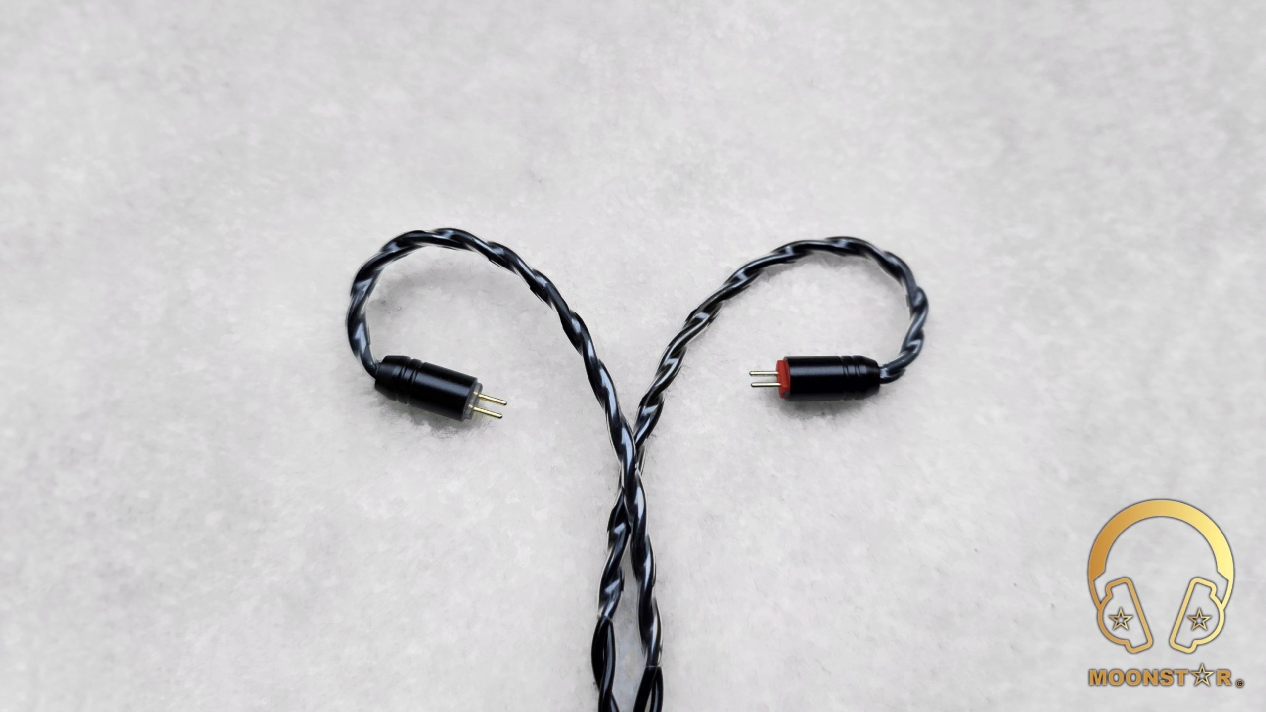 The cable features 2-pin male connectors with a 0.78mm diameter. These are clearly marked for ease of use, with a red indicator for the right channel and a transparent marking for the left channel, ensuring quick and accurate connections.
