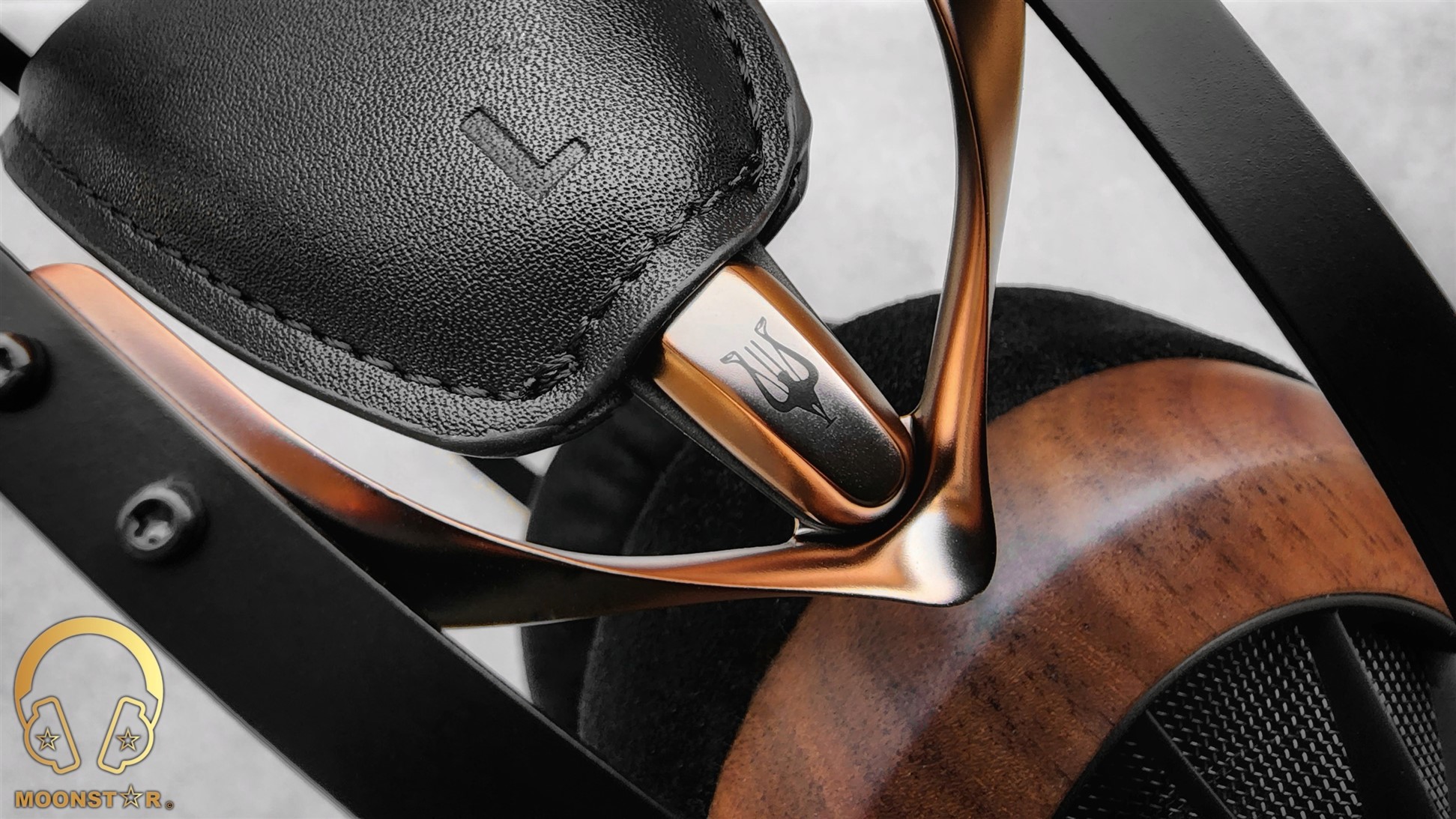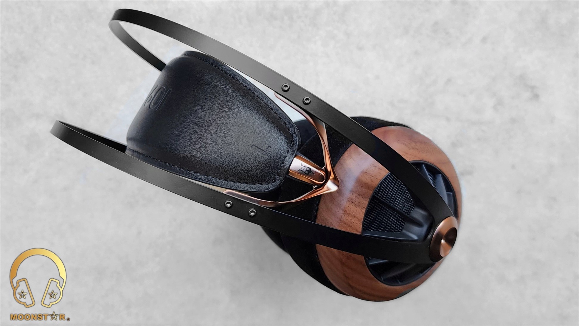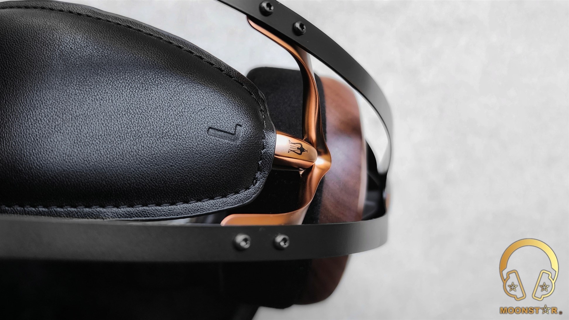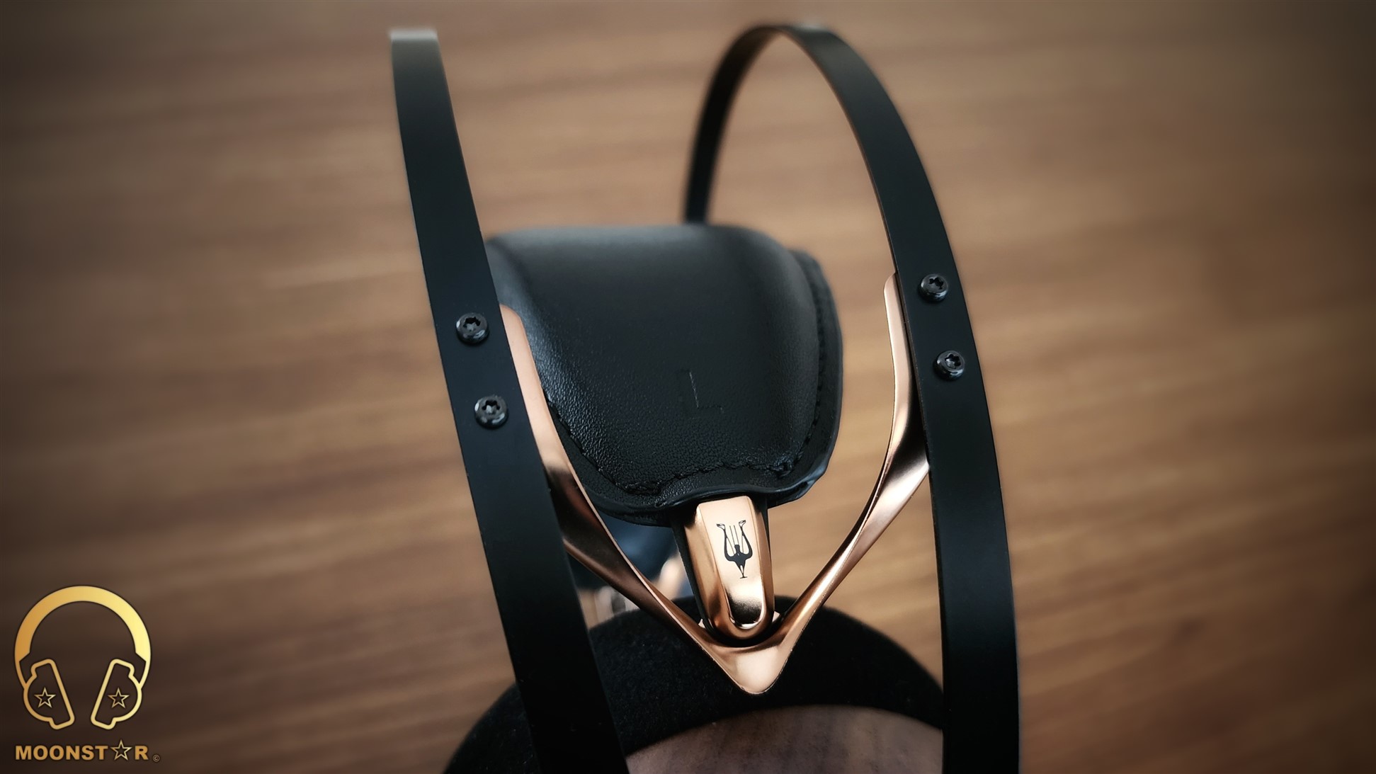 There is fancy looking metal part in form of a wishbone that fixes the crown to the self-adjusting headband system. This part seems to be made from zinc alloy material with a finish in copper color that has the Meze Audio logo on the top, which is one other eye-catching design element of the 109 PRO.