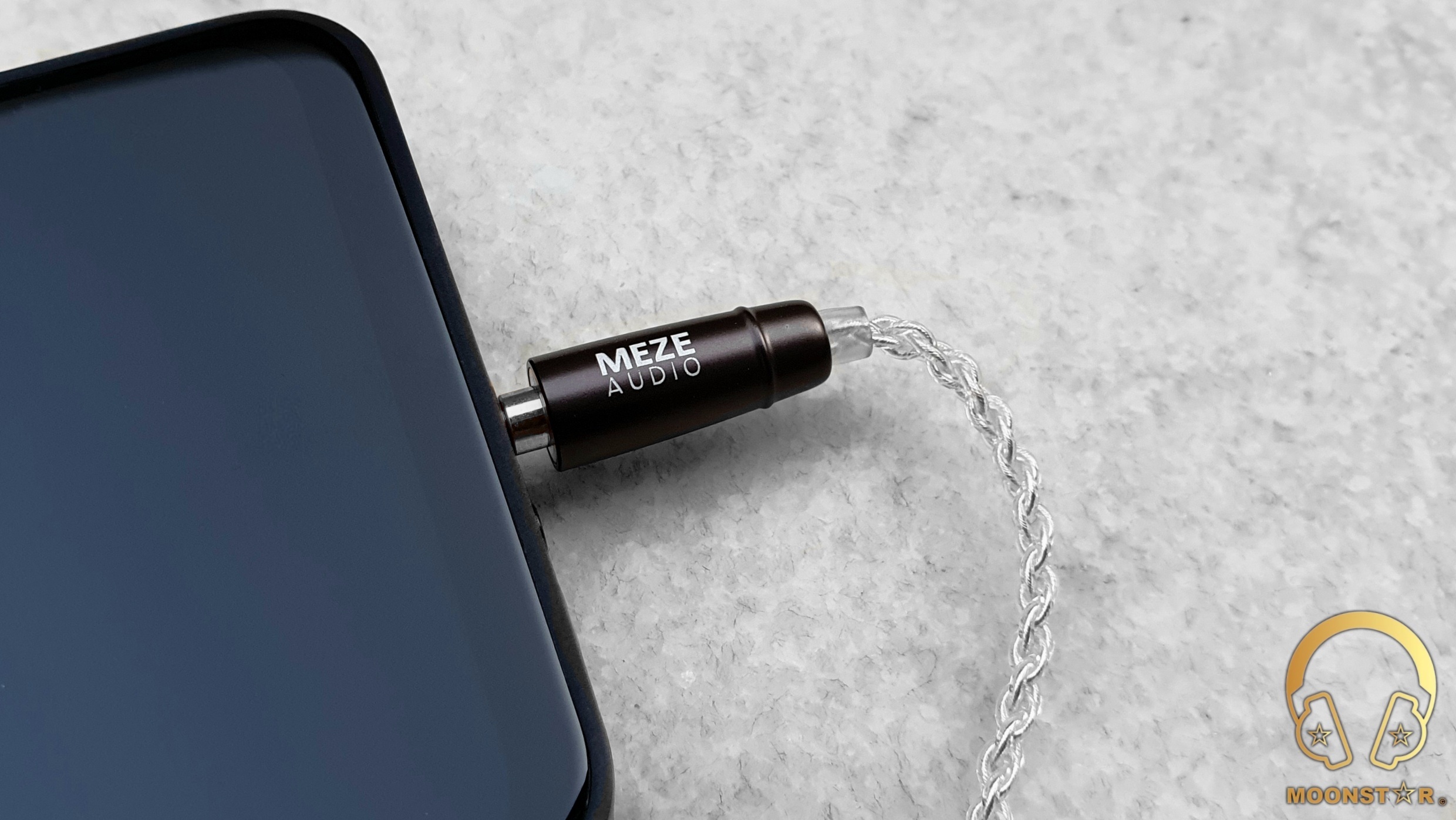 The 3.5mm (TRS) headphone jack has a straight profiled metal headphone housing that has the Meze brand logo on the top.