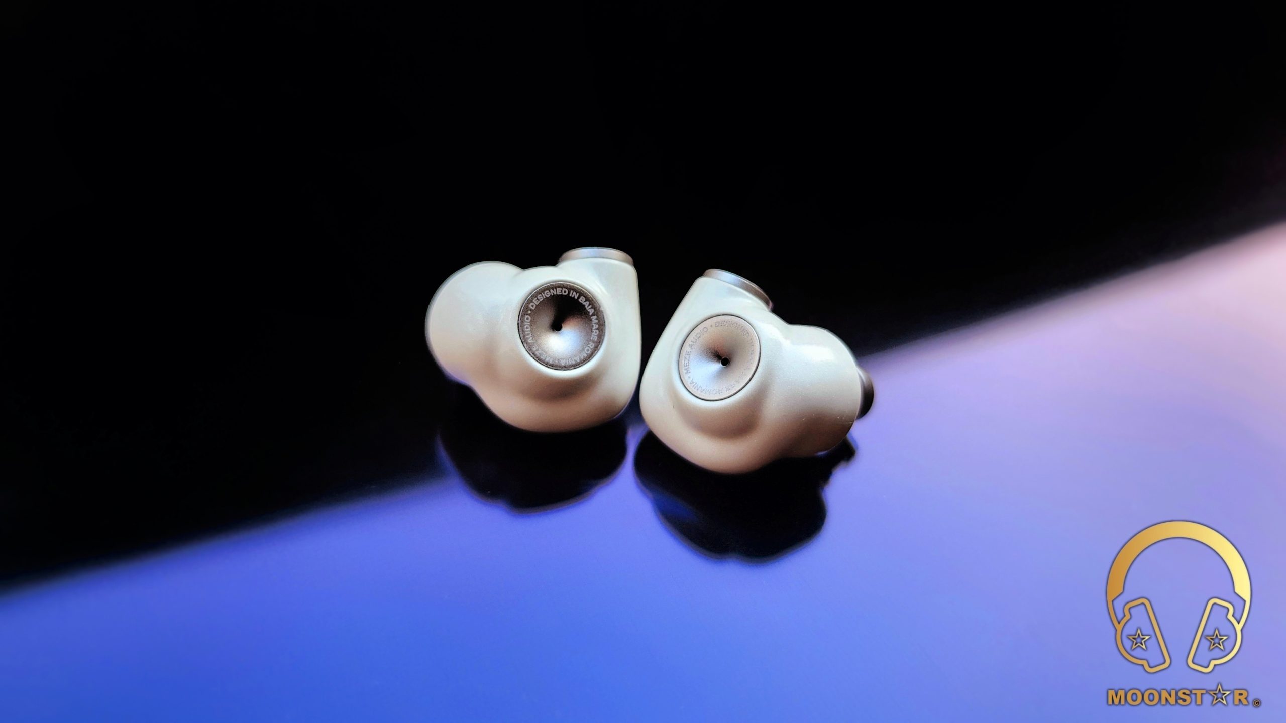 The rear of the monitors features slightly angled sound nozzles for a comfortable and secure in-ear fit. A fine woven metal mesh protects these nozzles from unwanted particles like dust and earwax. Additionally, a small vent near the sound nozzle allows for pressure relief from the dynamic driver, enhancing audio clarity.