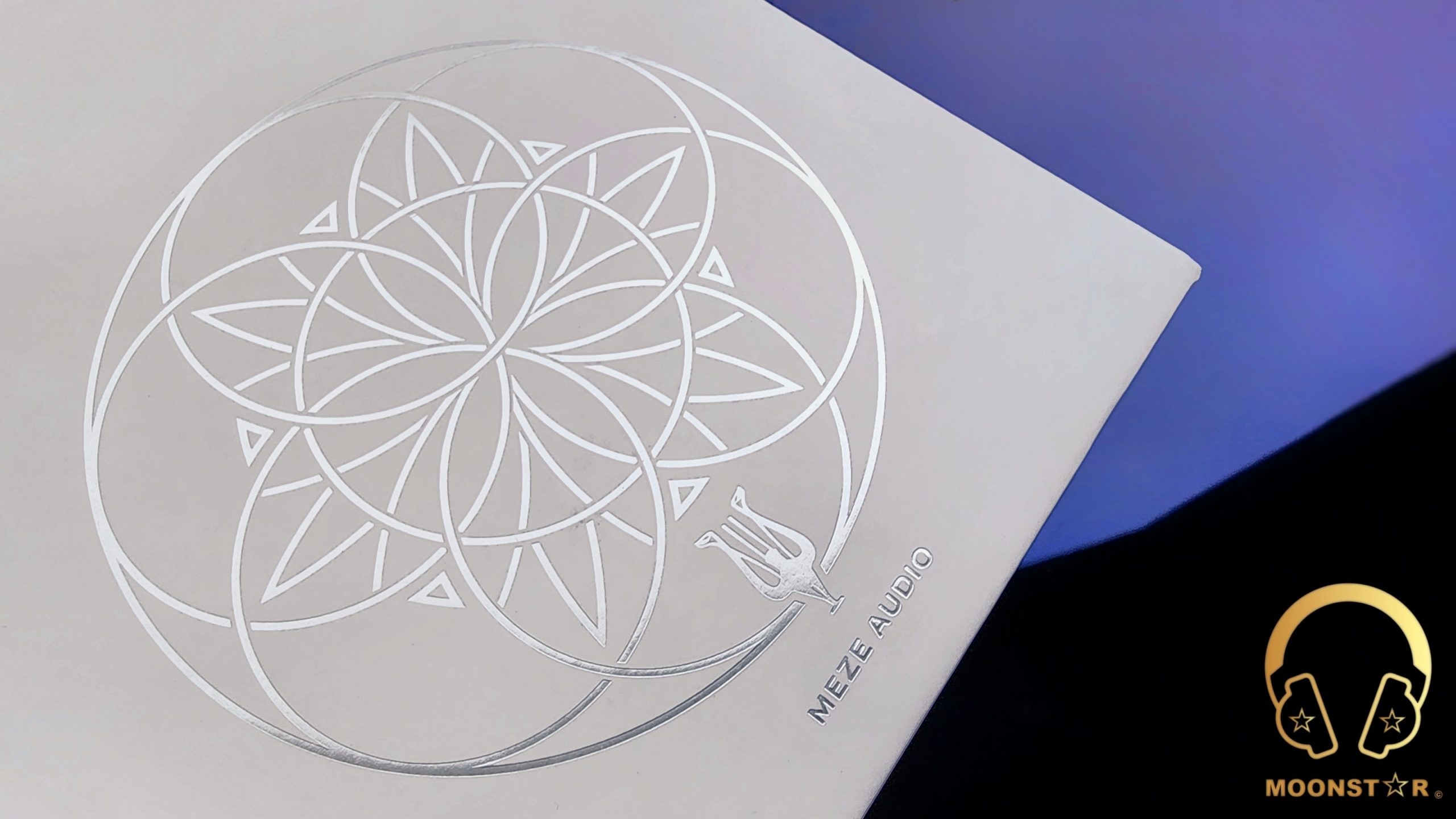 The Meze Audio Alba arrives in a compact, white cardboard box. The box departs from a purely minimalist design with the inclusion of a silver, Mandela-like pattern embossed on the top. Subtly incorporated at the bottom of this design is the Meze Audio branding. This decorative element adds a touch of sophistication to the otherwise clean packaging.