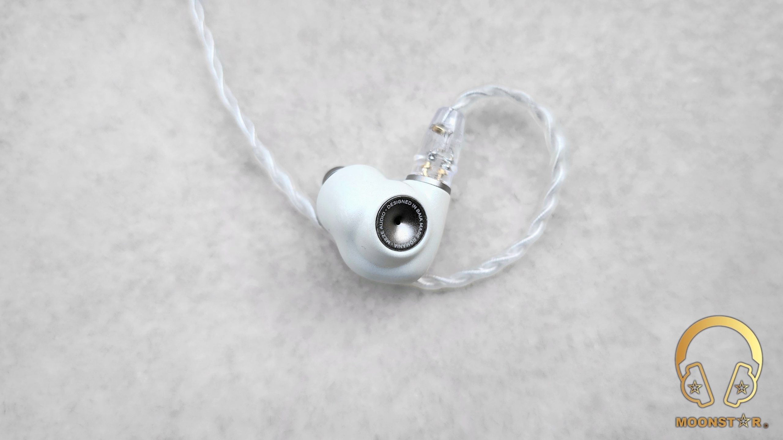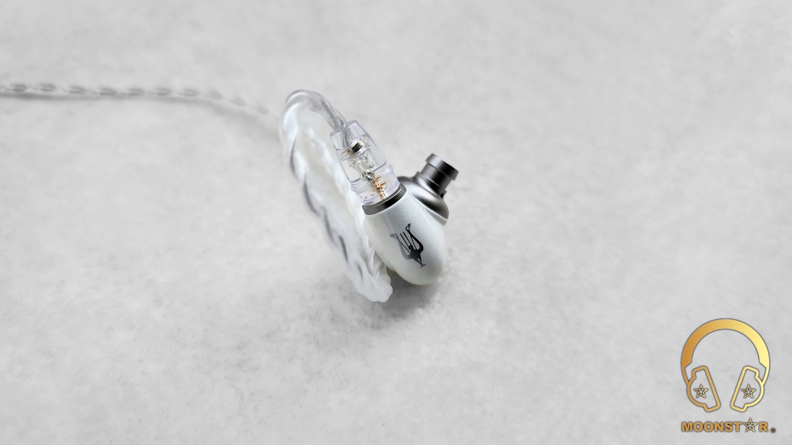 The top of each monitor shell features a 0.78mm diameter 2-pin connector interface surrounded by a sleek gray metal ring. This interface provides a secure and reliable connection with the detachable cable’s male connector. Notably, the ALBA is the first MEZE IEM to utilize 2-pin connectors instead of MMCX, offering a more widely available and user-friendly option.