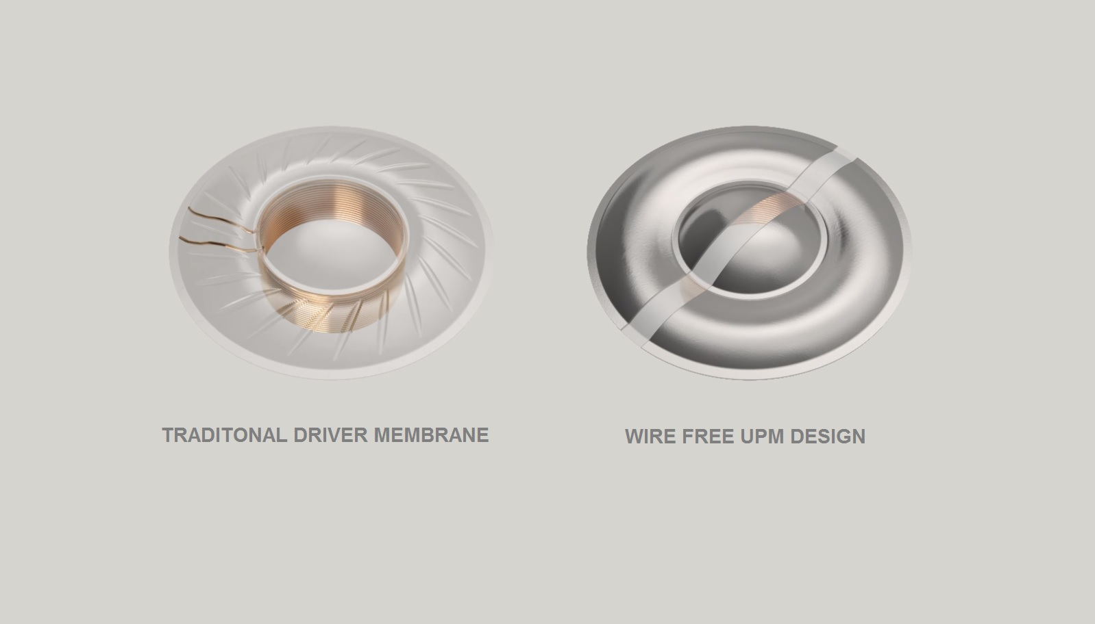 The new UPM driver eliminates this inconvenience by using a totally different approach: the membrane itself is electrically conductive and, therefore, no wires are attached to the diaphragm. The result is a symmetric pistonic motion through its entire movement, without disturbance from the unbalance created by wires.