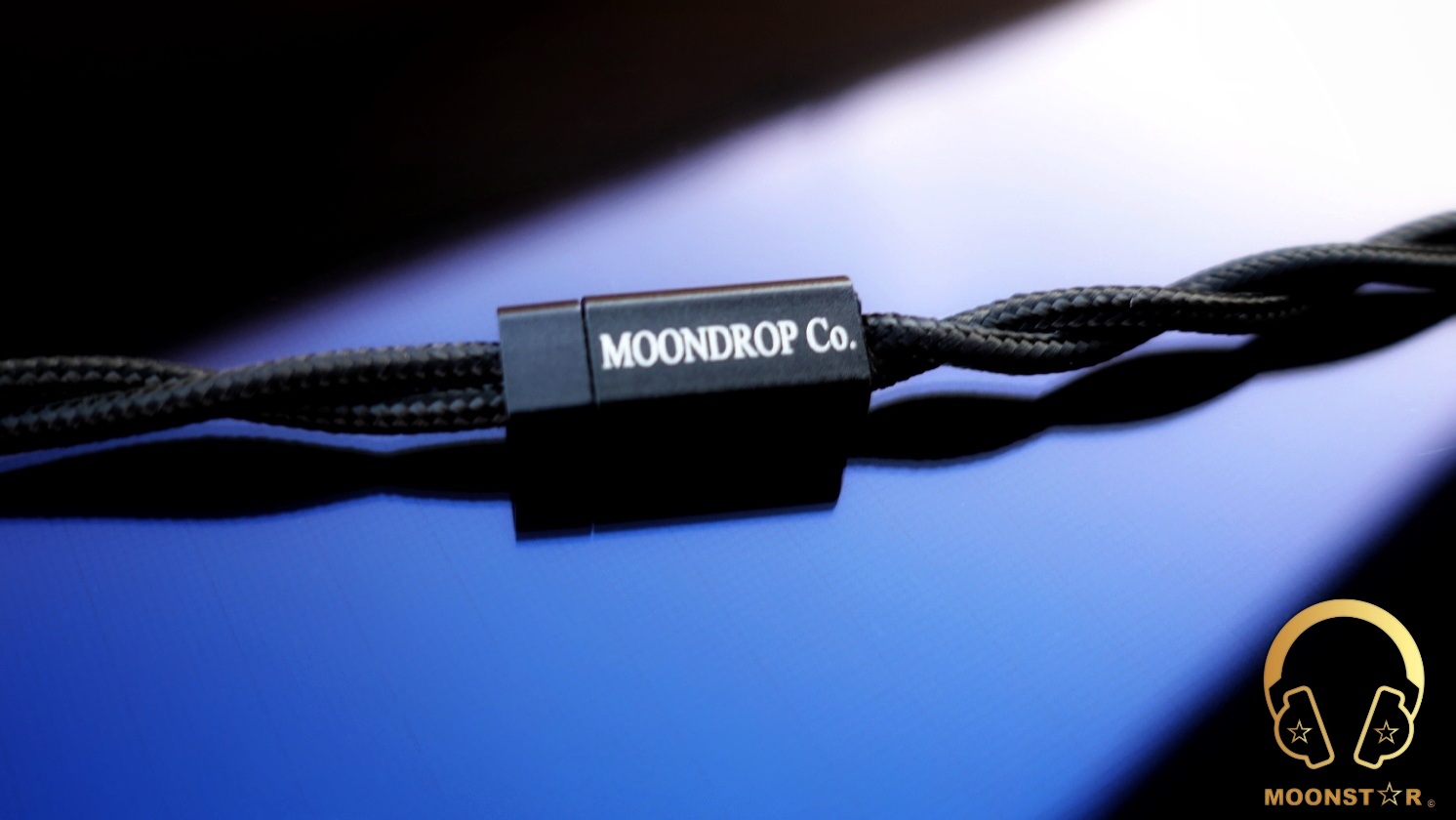 The cable sports a metal chin slider and metal Y splitter in black color. The Y splitter has a Moondrop branding on its surface.