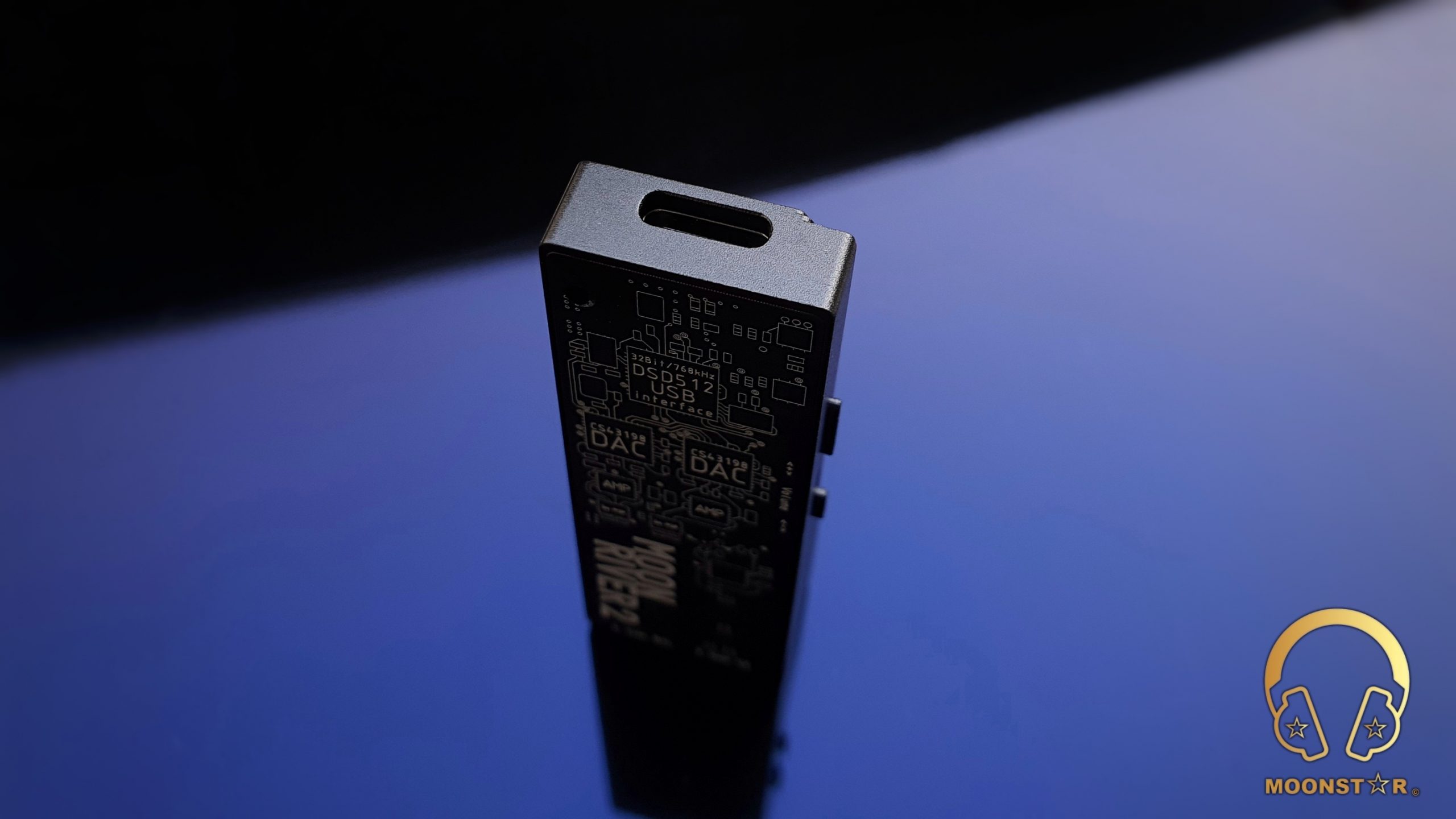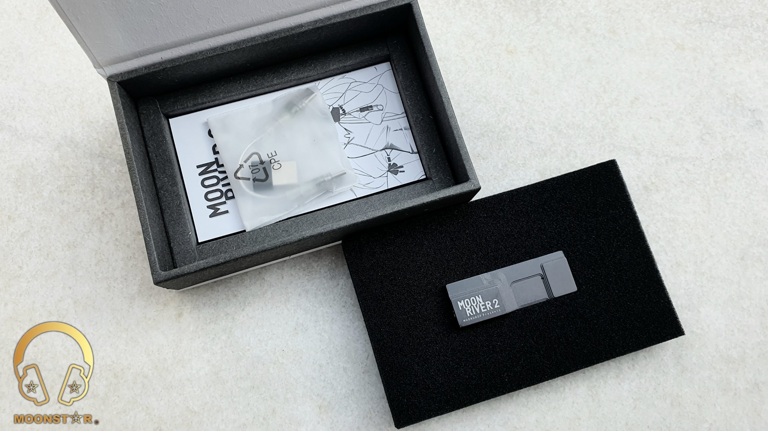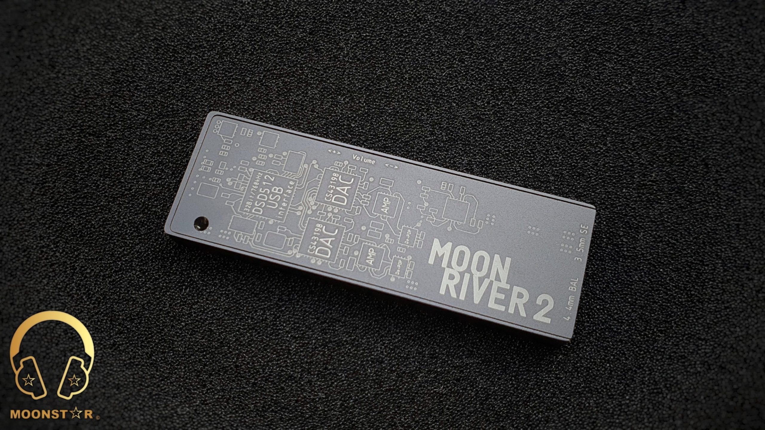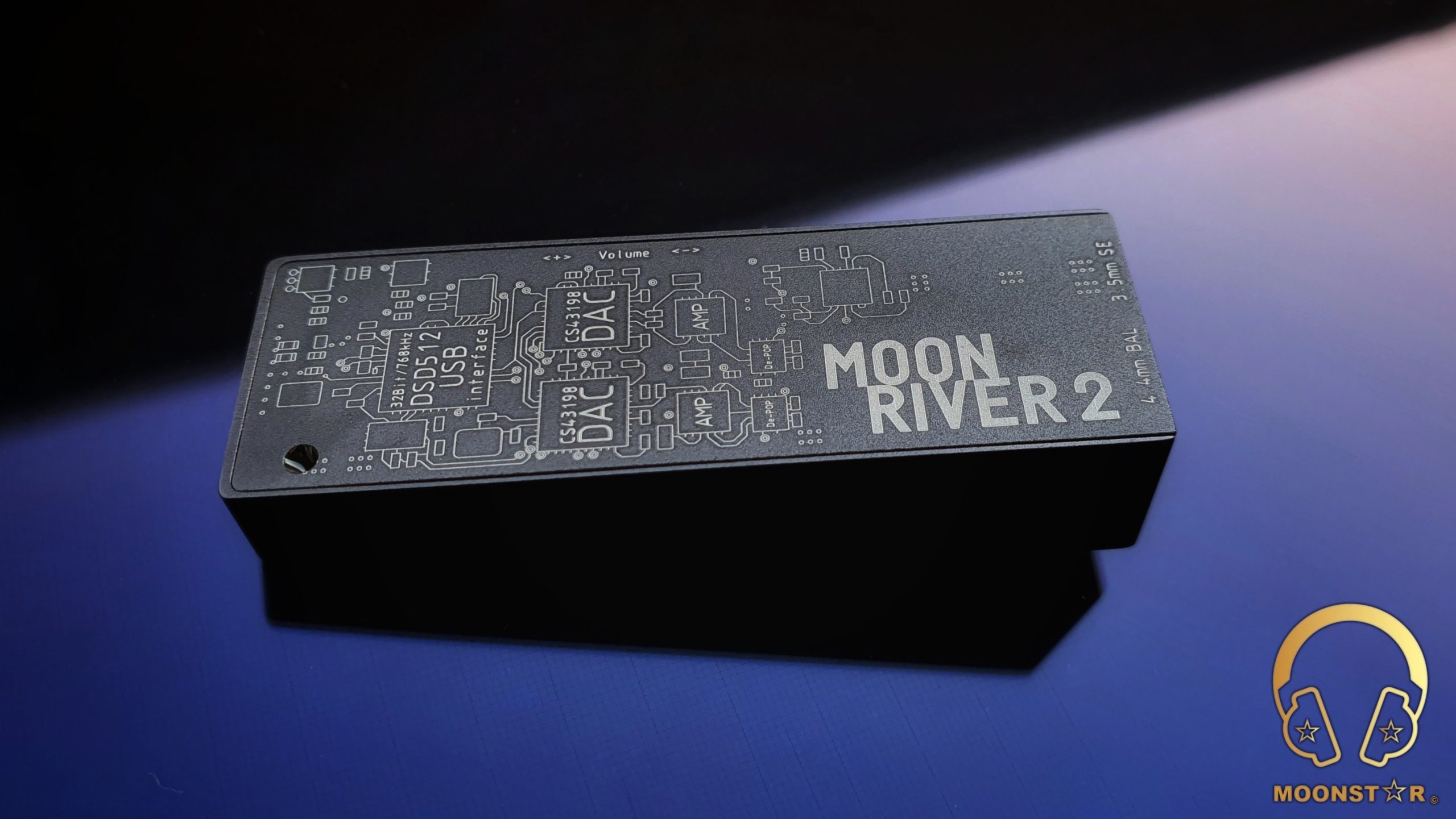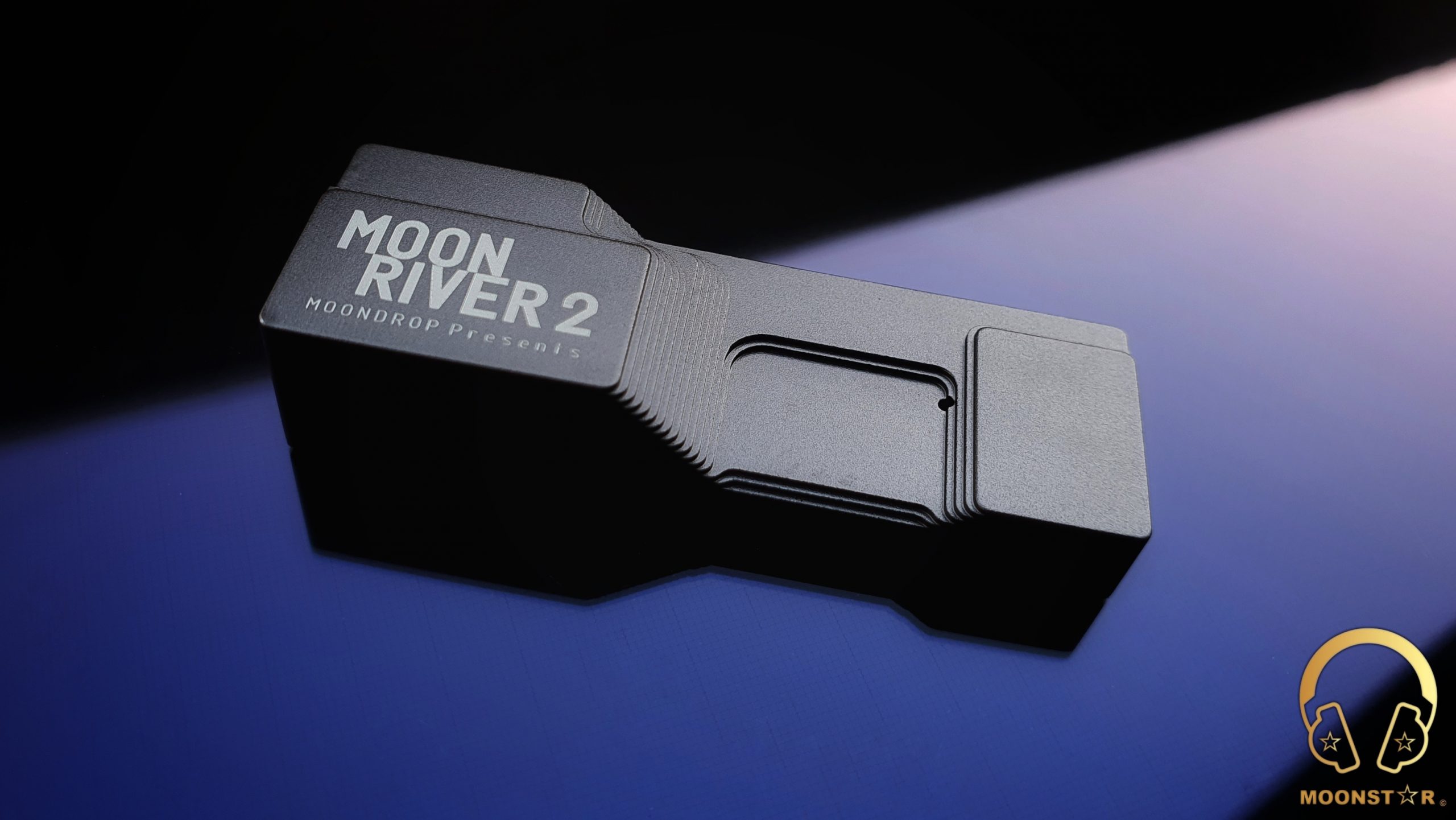 The aluminum housing has a dark grey anodized surface that is in coherence with its modern industrial design concept. On the top of the device is the laser engraved Moonriver 2 branding (Moondrop Presents Moonriver 2) and a small LED status indicator light.