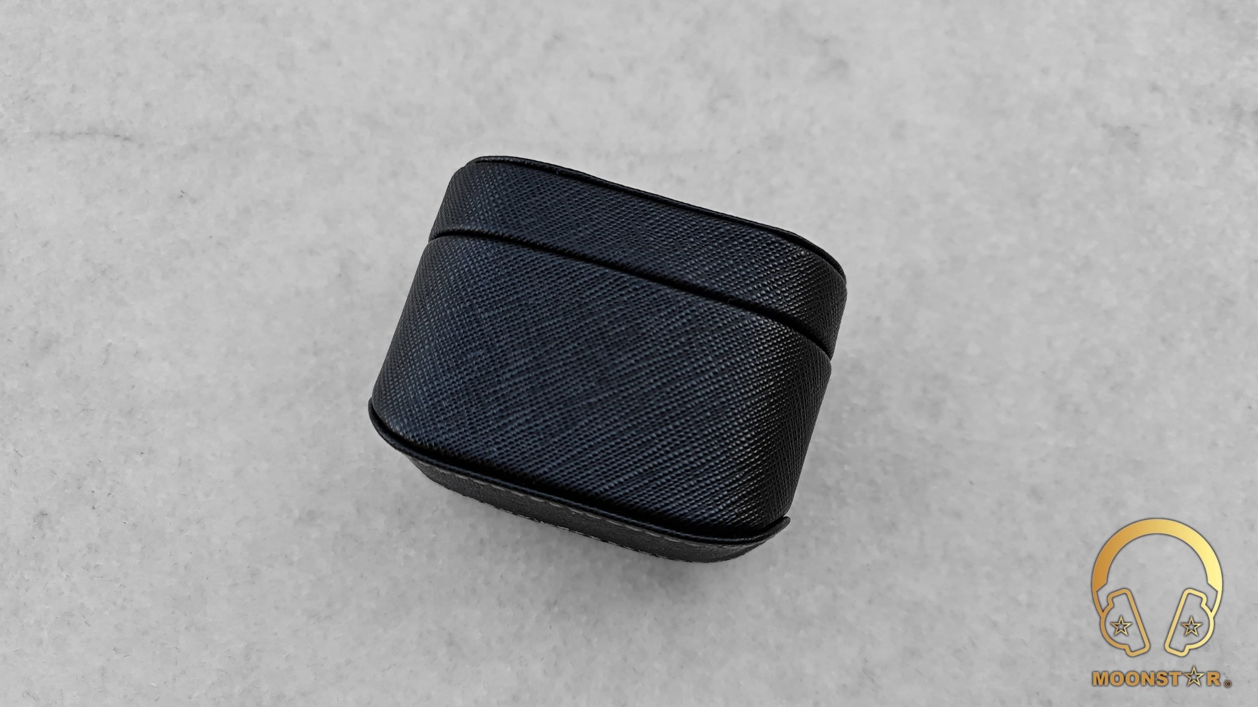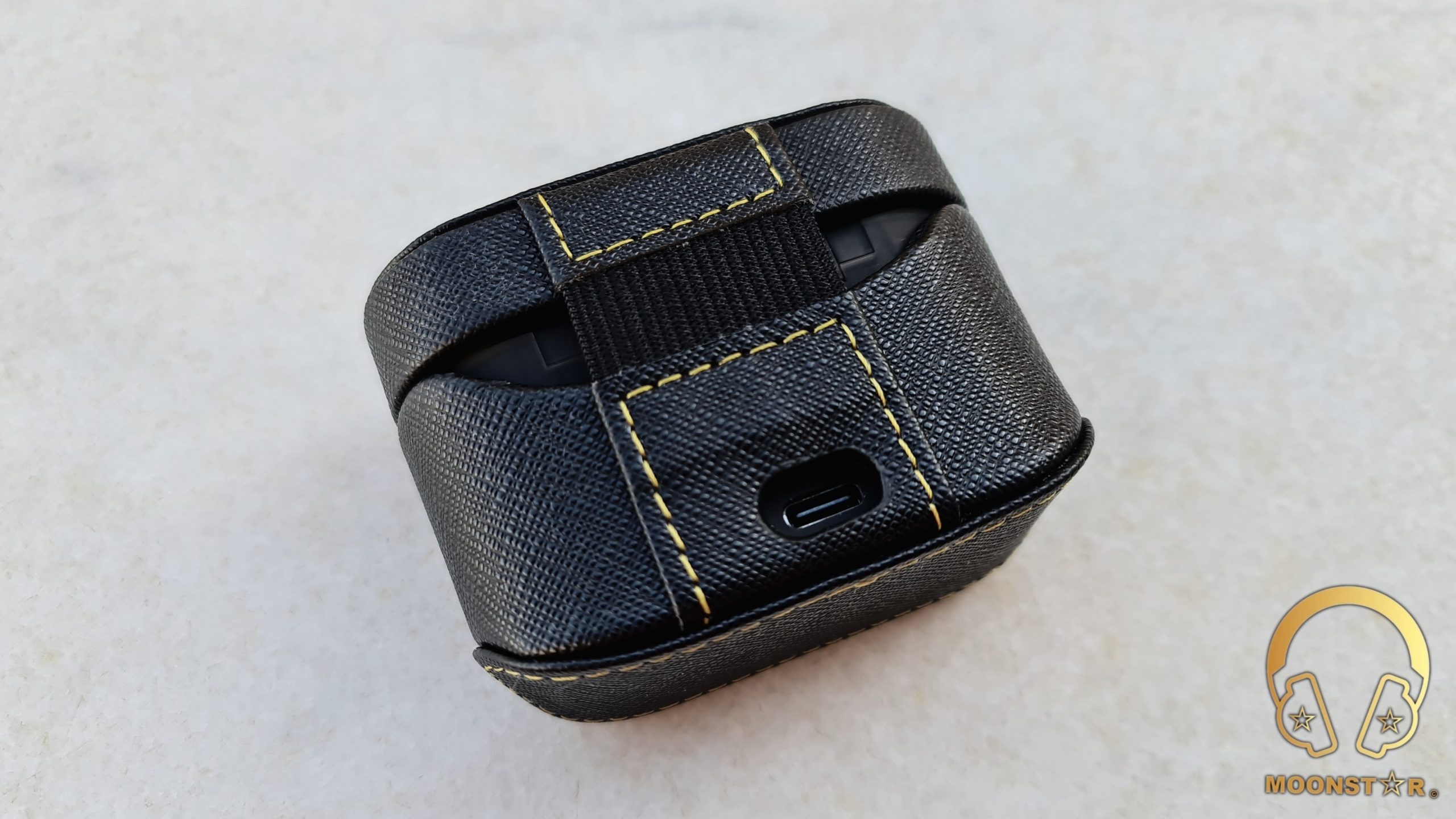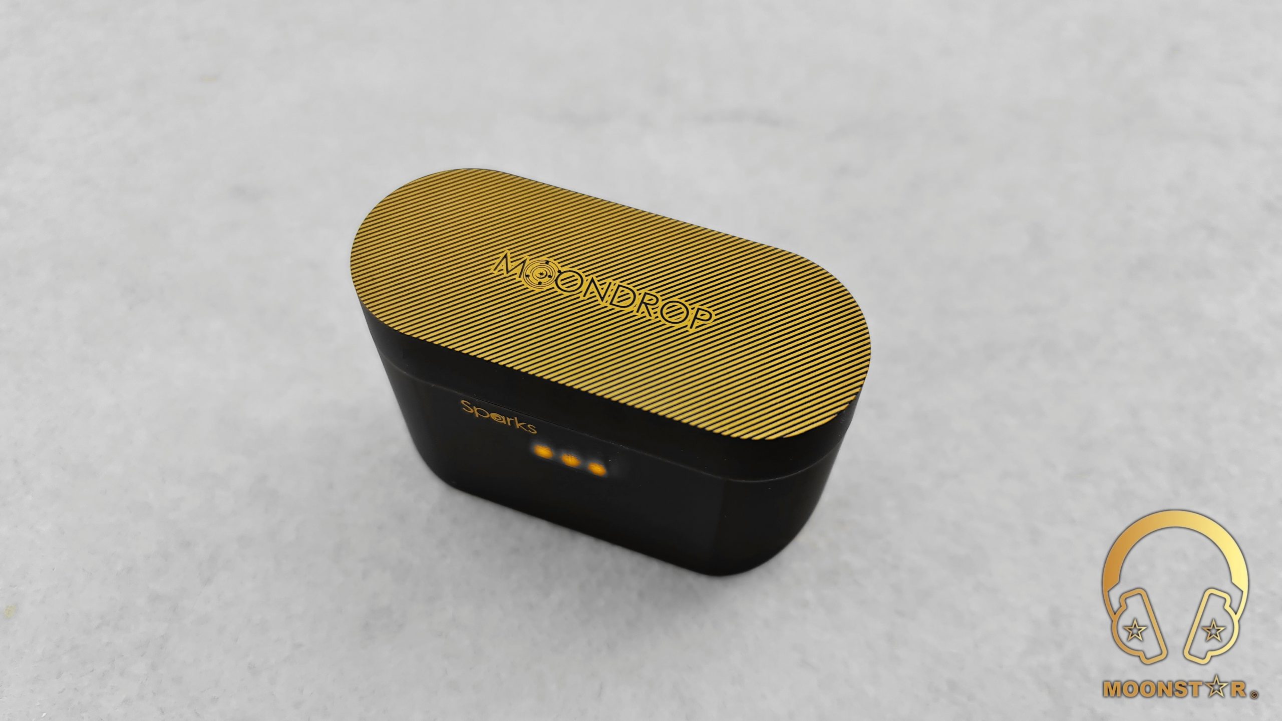 The charging case of the MOONDROP Sparks is made of the same plastic material like the Monitors and has the same soft matt surface which offers a nice to touch feel when you hold it in your hands. On the top of the charging case has a nice pattern in yellow color and sports the stylish MOONDROP logo.