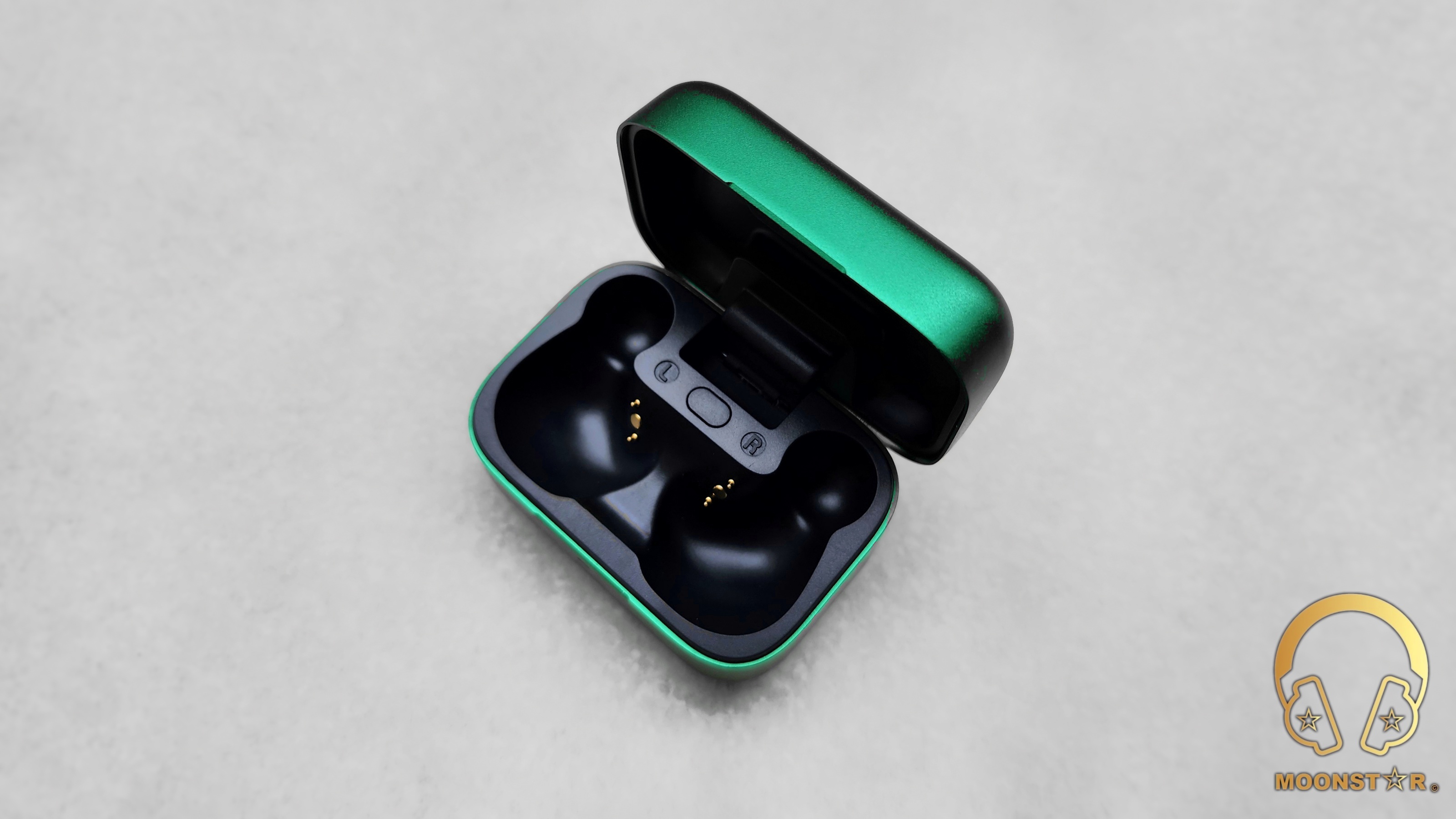 Turning the monitor over, I can see the charging connectors on the inner surface. They magnetically snap into the charging case easily, which is always convenient. The inner surface features also the L (Left) / R (Right) indicators.