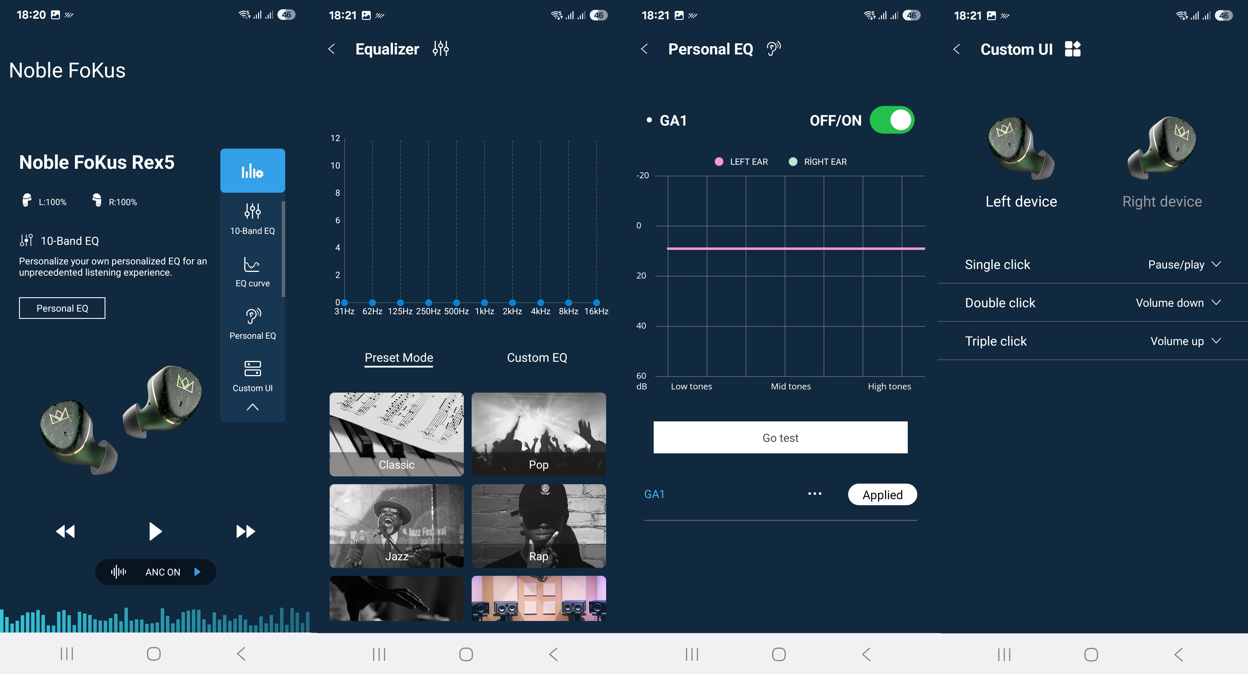 Noble FoKus APP is a quite useful application that you can download from Google Play (Android) and App Store (iOS) that offers also a sound personalization feature that has been implemented in collaboration with Audiodo. The setup process in the app included a hearing test, which involved playing different tones and prompting the user to tap when they could hear them. This straightforward process aims to tailor the sound specifically to the user’s ears. After completing the test, the app generated a custom sound profile. This profile is saved within the FoKus Rex5, allowing for personalized sound across different devices without relying solely on the app.