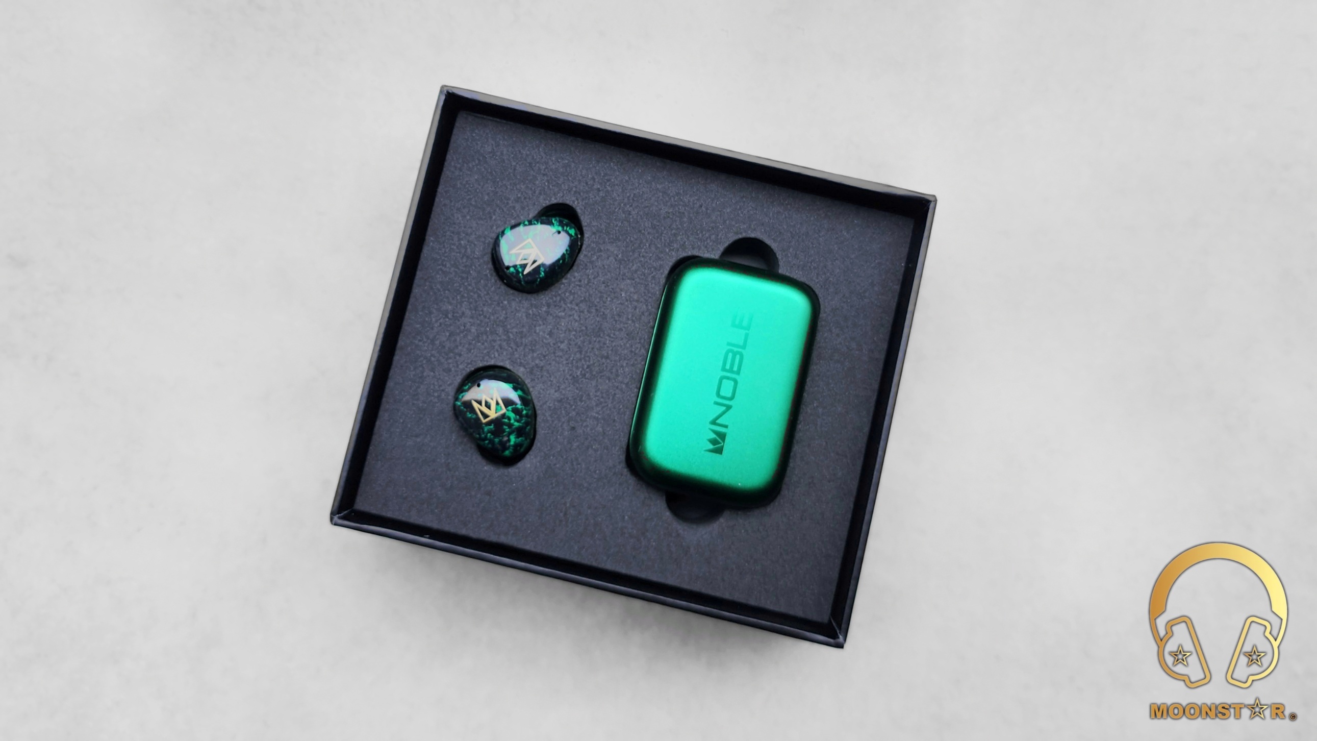 The case sports a matching green color with a subtle shimmer, echoing the unique marbled pattern of the earbuds themselves, further enhanced by the NOBLE logo in a debossed oval plaque on the top.