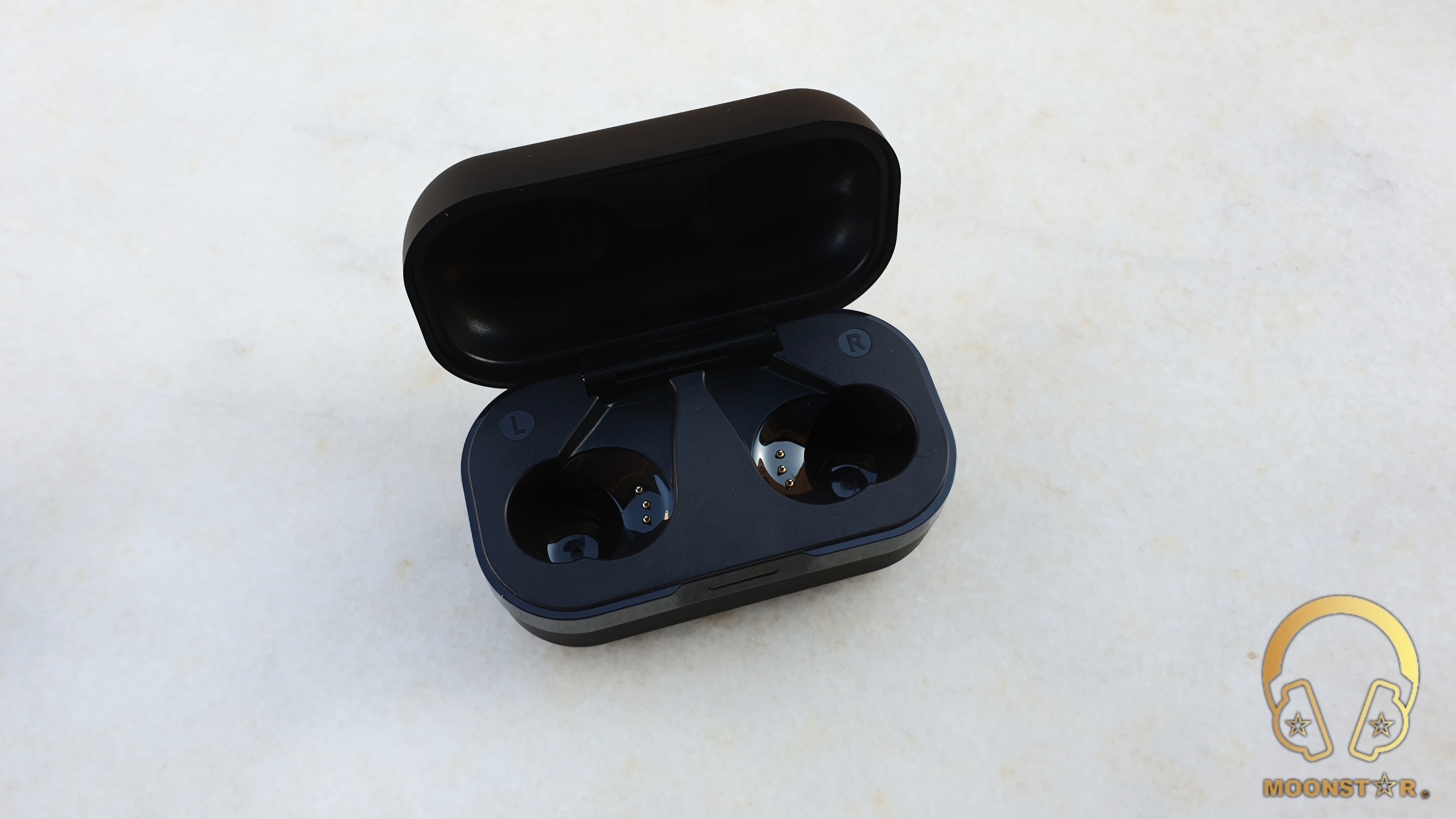 On the backside of the monitors are Left or Right markings, LED status lights and the Omni-directional microphones. Here are also the charging ports/connectors on each earpiece that helps to charge the build in battery’s when you put them inside the caring case.