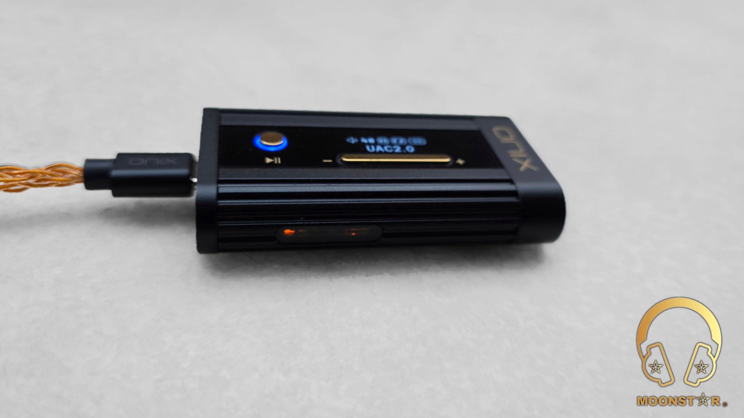 The front panel is dominated by the tall, narrow 0.87-inch monochromatic OLED screen, framed by a thin gold-accented bezel that matches the “ONIX” logo laser-etched at the top in elegant, minimalist typography. Below the screen sits the central multifunctional button, ringed by a soft cyan backlight that pulses during operation, serving as a power indicator, playback status light, and mode confirmation. Flanking the screen on the right is the vertical multicolour LED light bar, a thin strip that shifts seamlessly through blue, green, yellow, purple, white to indicate sampling rates, adding a layer of functional beauty and instant visual feedback.