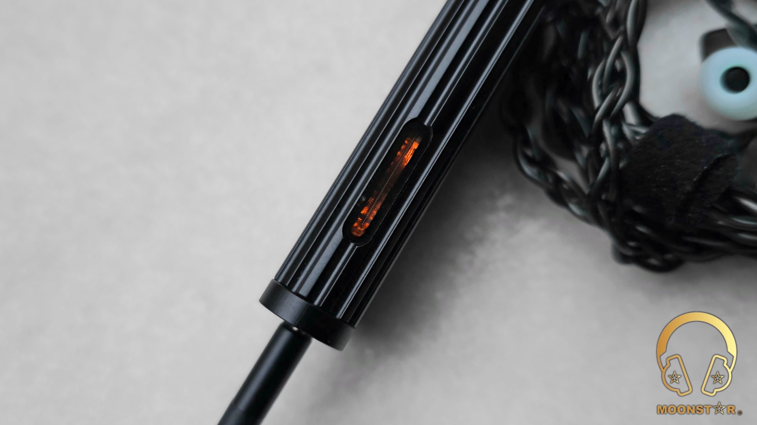 At the heart of its visual charm are the two narrow, elongated windows cut into the lower half of the front face, precisely positioned to reveal the glowing filaments of the dual JAN6418 pentode tubes. When tube mode is engaged, these windows come alive with a warm, amber-orange glow that pulses gently in sync with the audio signal. The light is diffused through frosted acrylic inserts, preventing harsh glare while allowing the tubes’ characteristic filament structure to remain visible, like tiny vintage bulbs suspended in a high-tech chassis. In a dark room, this glow casts a soft, retro-futuristic halo across the surrounding aluminum, making the Beta Xi2 feel alive, almost like a miniature tube amplifier from the golden age of hi-fi, reimagined for the pocket.