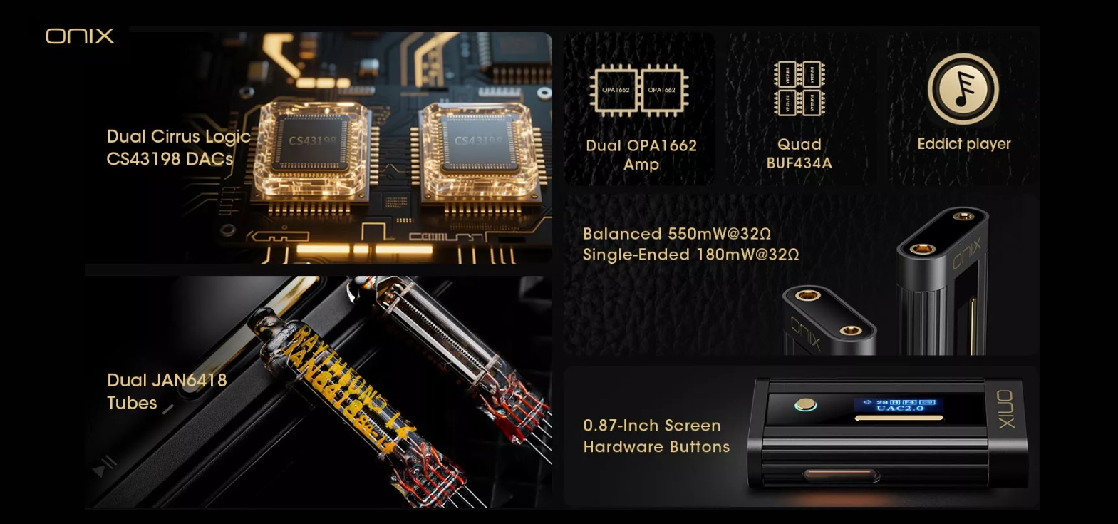 Unboxing the ONIX Beta Xi2, I was struck by the density of innovation squeezed into its tidy shell. Dual long-lasting, low-heat JAN6418 tubes, partnered with Shanling’s tube expertise, deliver that signature analog glow with quick on/off switching. Backed by twin Cirrus Logic CS43198 DACs and an upgraded OP + BUF architecture featuring dual OPA1662 op-amps plus quad BUF634A buffers for commanding drive. It masters PCM to 768kHz and native DSD512, turning any mobile rig into a hi-fi haven.