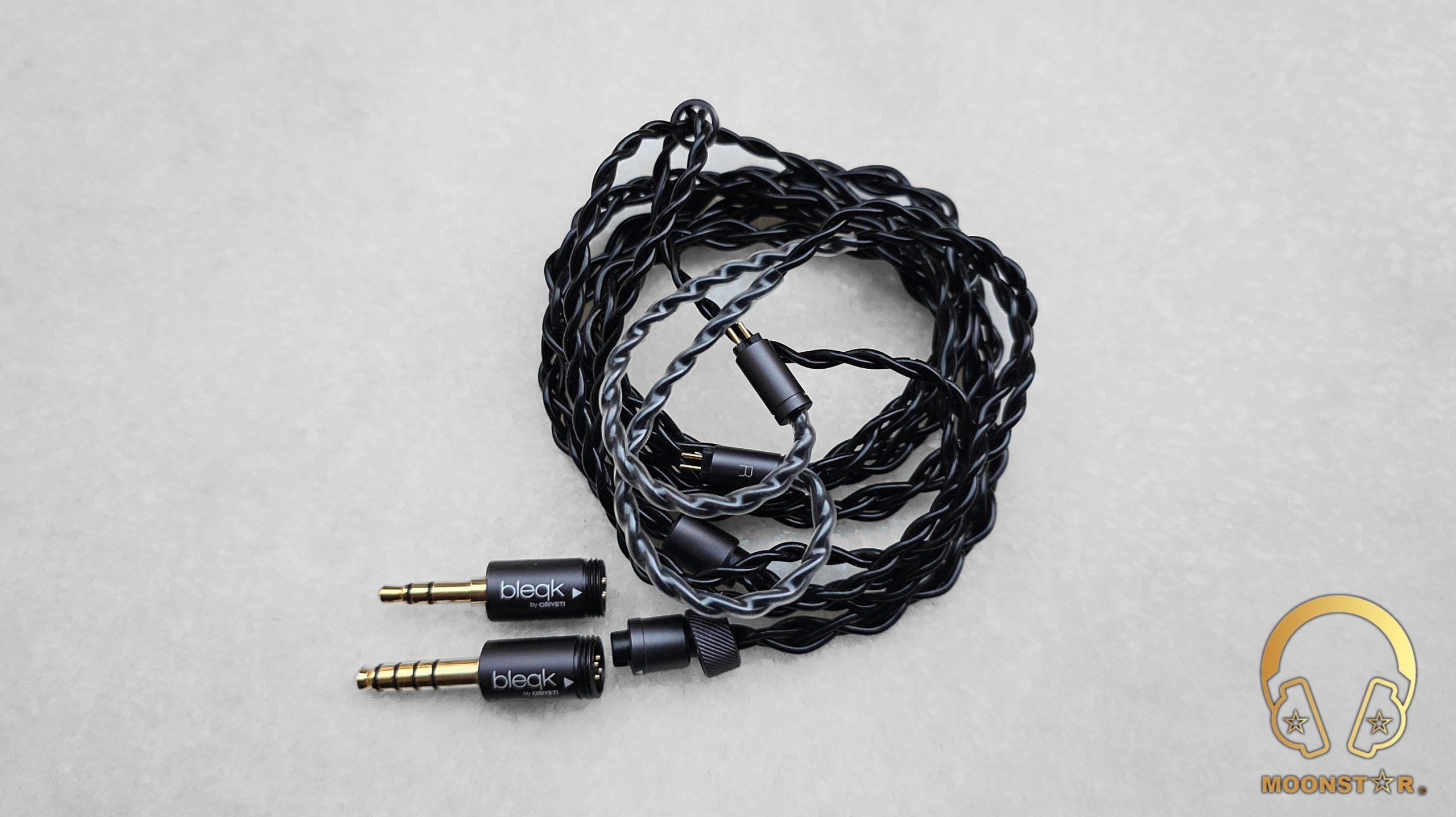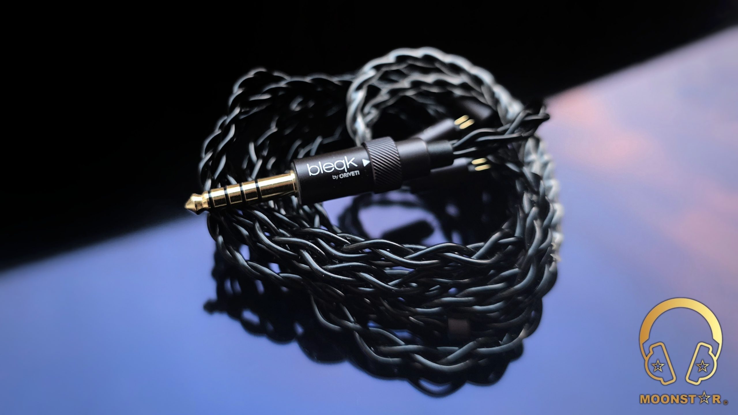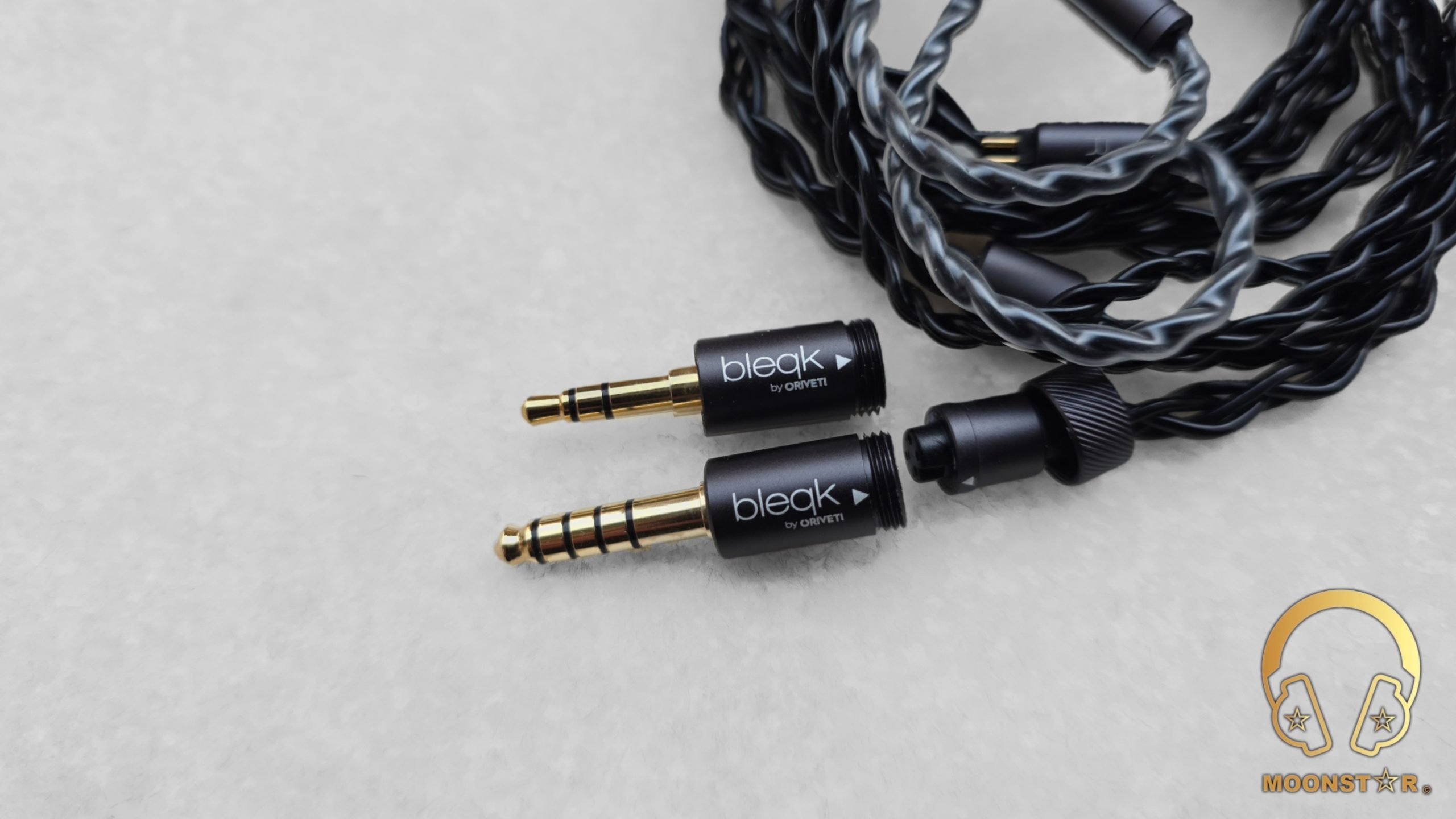 The straight 3.5 mm single-ended plug (gold-plated) plug is housed in a robust metal barrel carrying discreet “bleqk by ORIVETI” branding, while the strain relief is thick yet flexible, offering visible protection against repeated bending. A matching 4.4 mm Pentaconn balanced plug is supplied separately and screws on via a precise threaded collar.