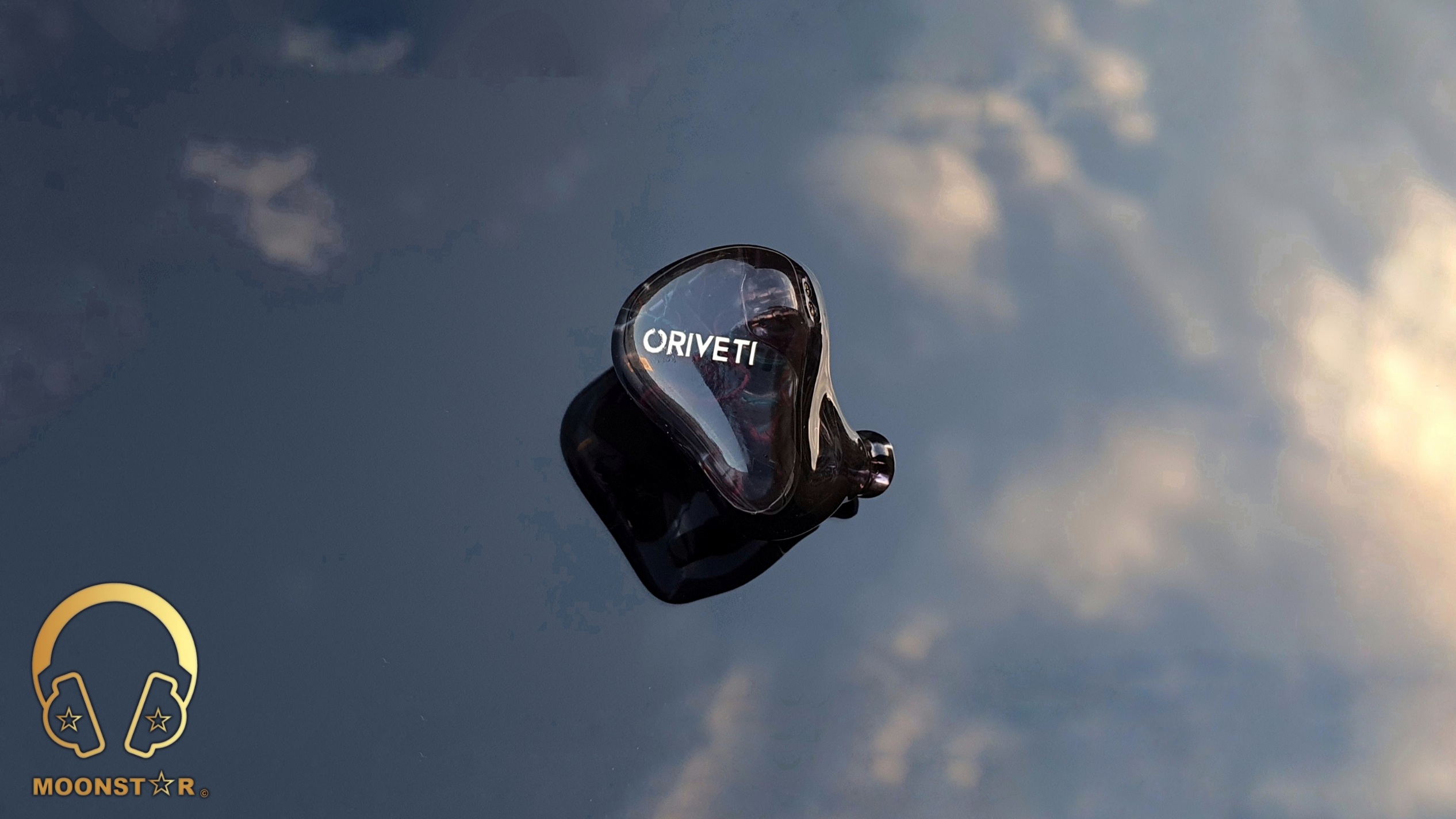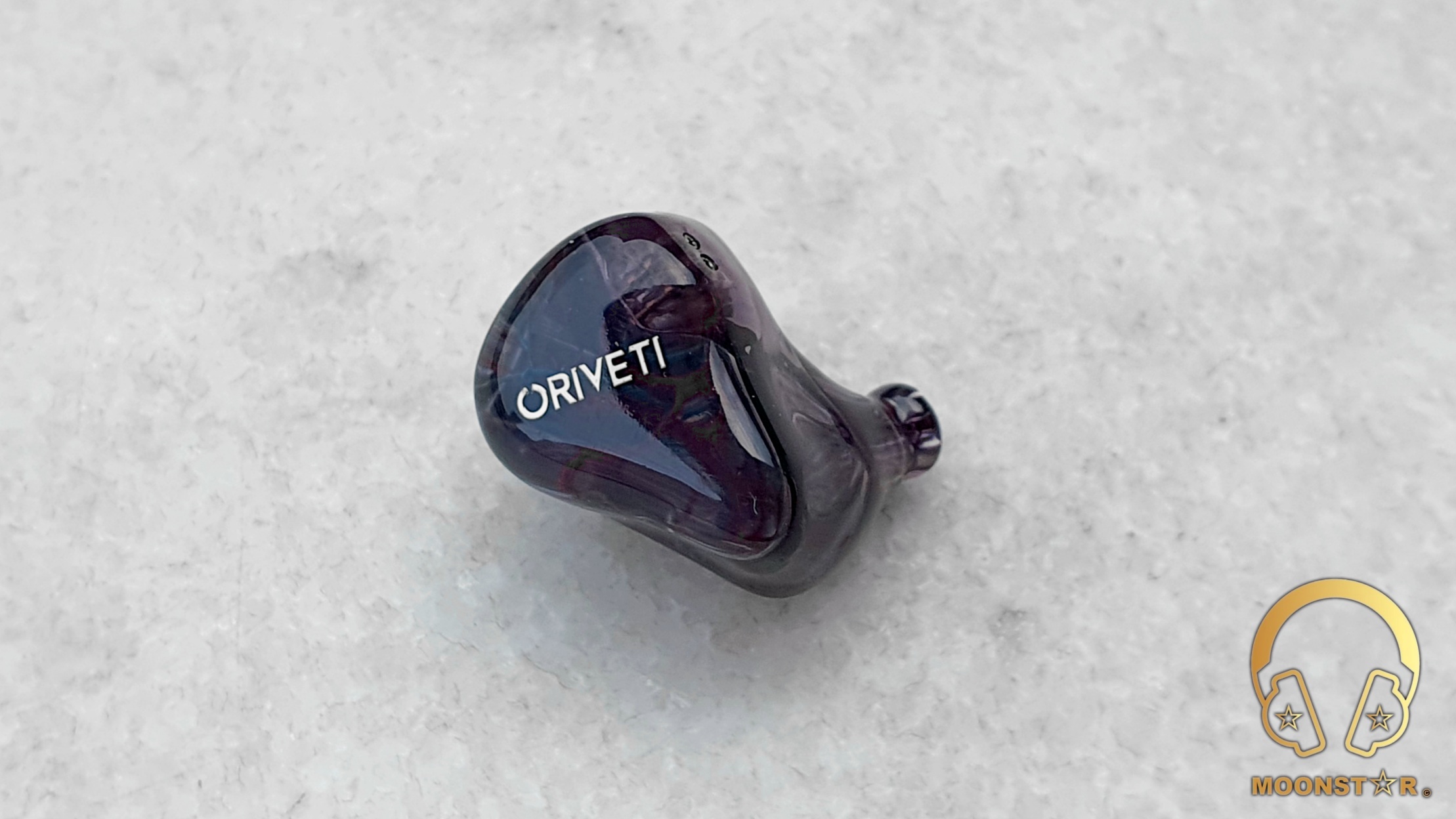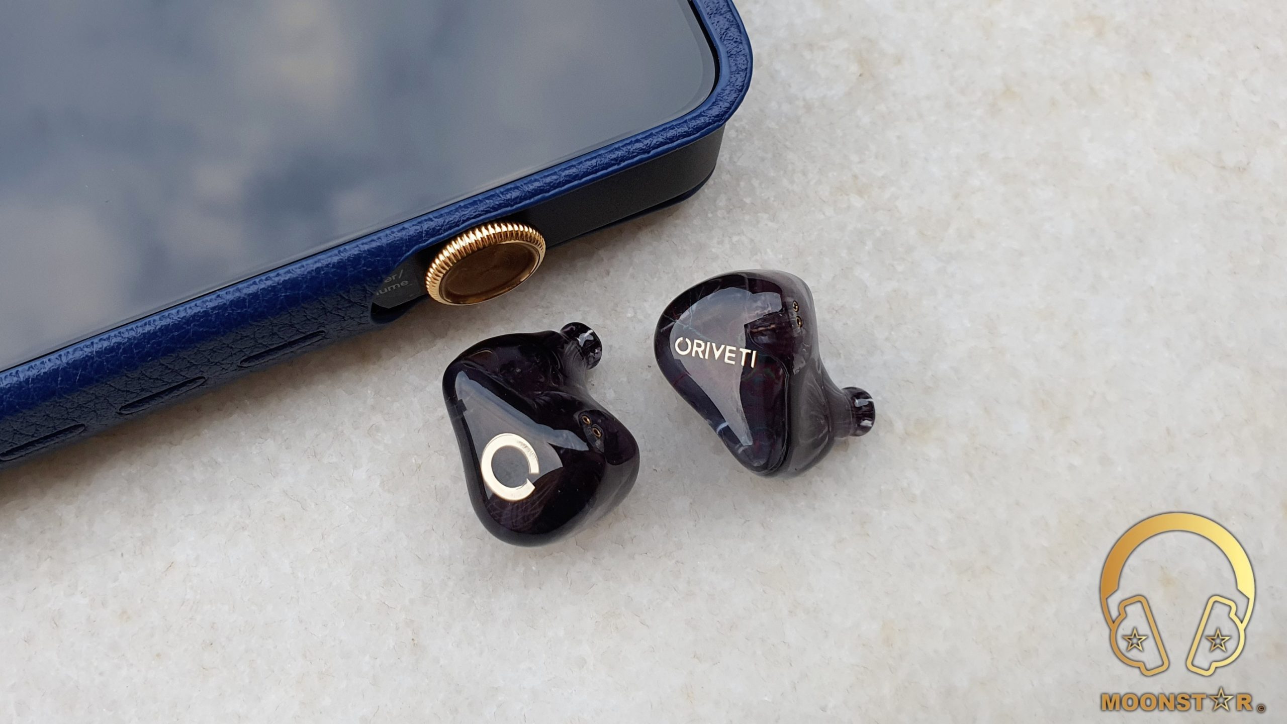On the front of each monitor shell are the brand logos of the company, which are the Oriveti branding (right earpiece) and a circular brand logo (left earpiece) that are both in gold color.