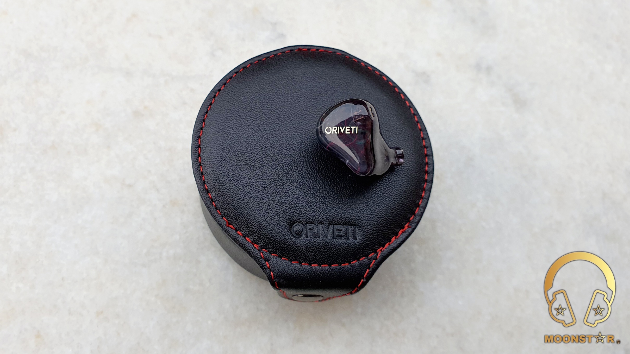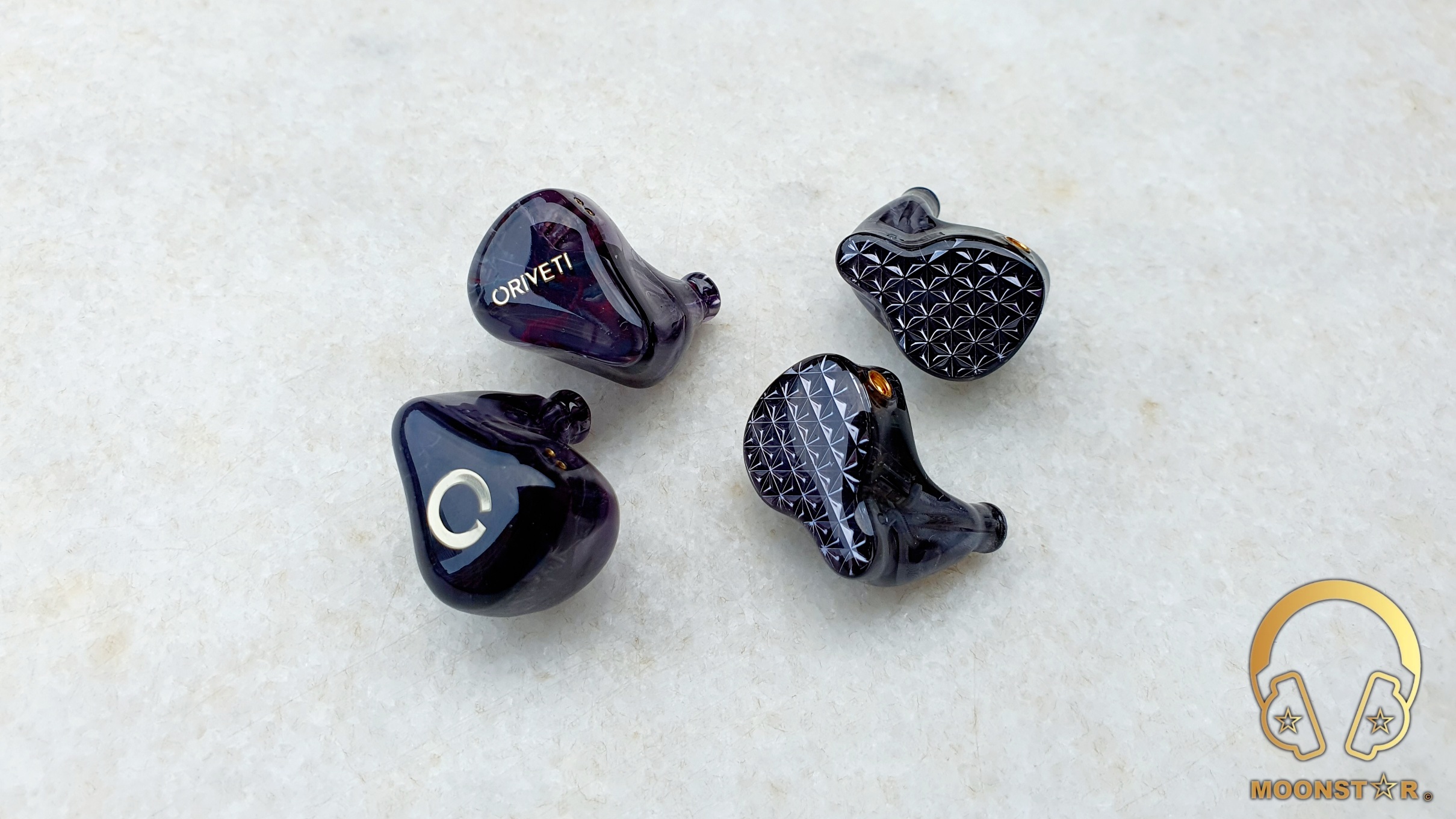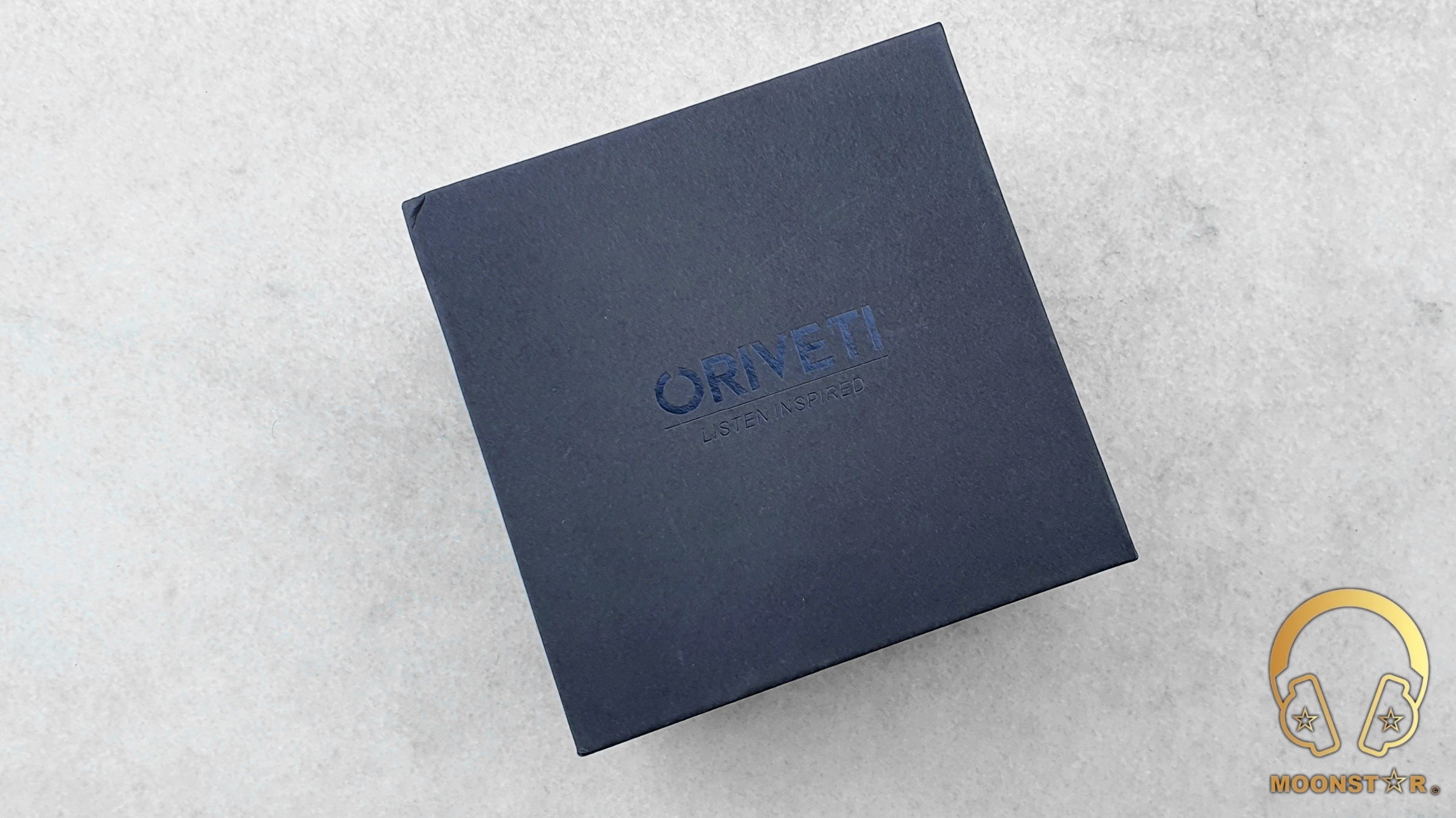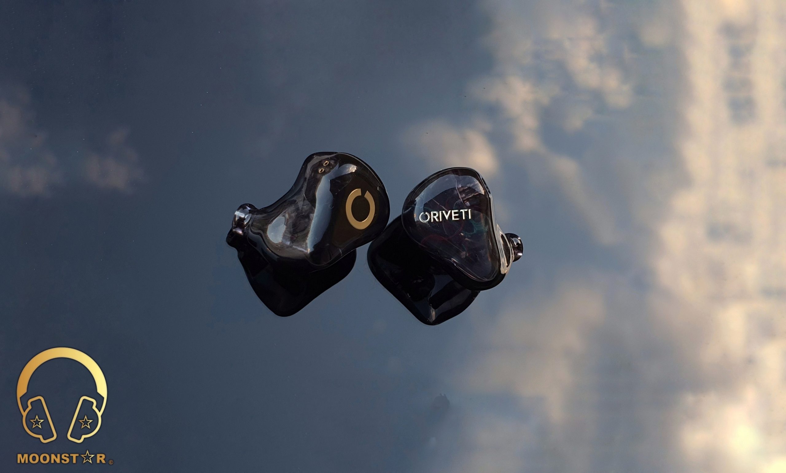On the front of each monitor shell are the brand logos of the company, which are the Oriveti branding (right earpiece) and a circular brand logo (left earpiece) that are both in gold color.