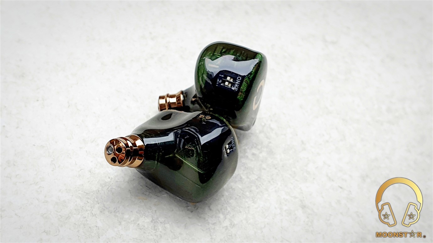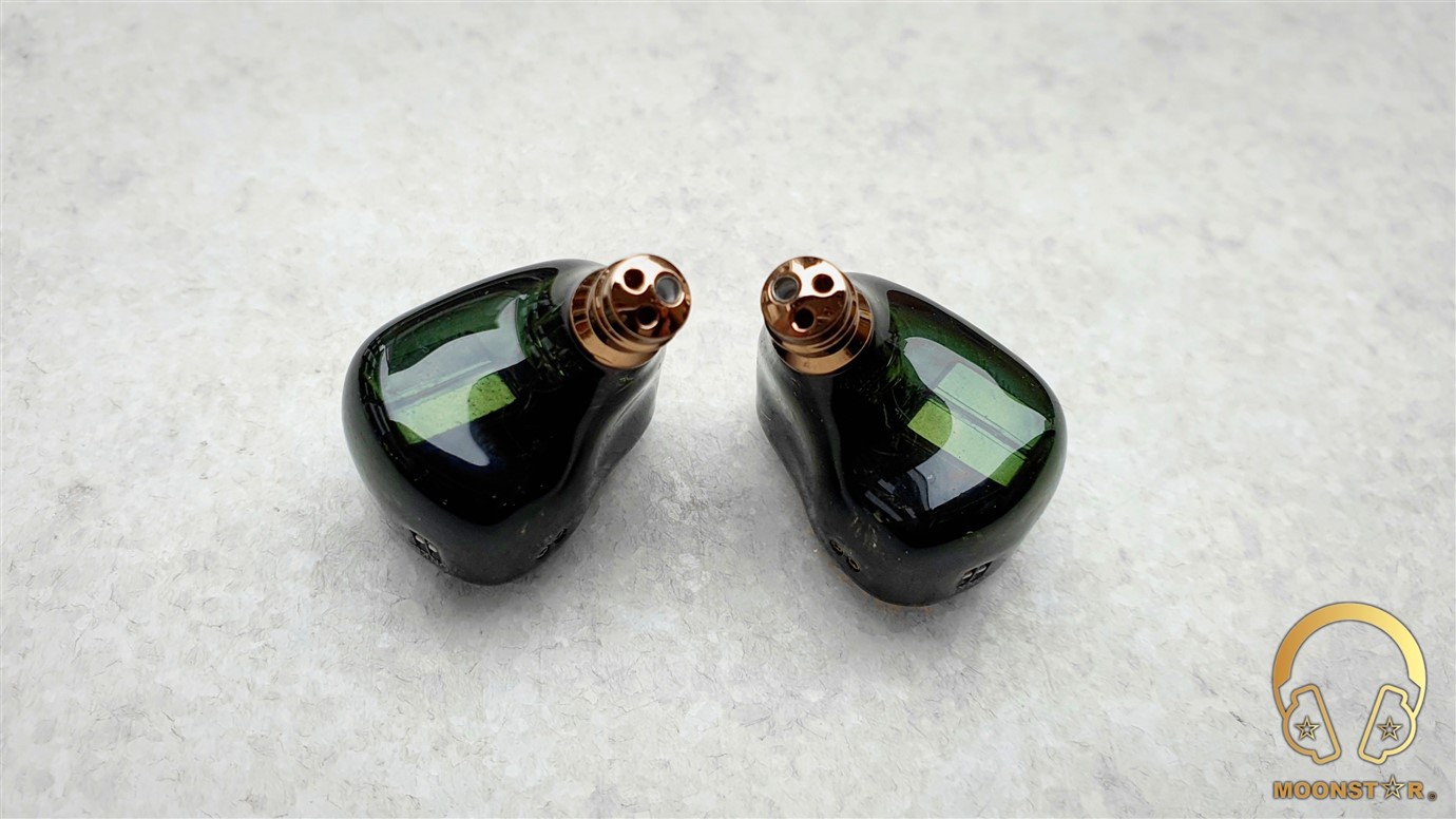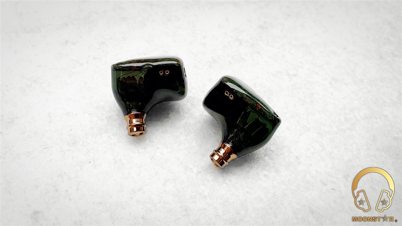 The beautiful handmade monitors are of high quality, which are made from semitransparent resin material in emerald green color that makes possible to see some internal parts like the 8 Balanced Armature Drivers.