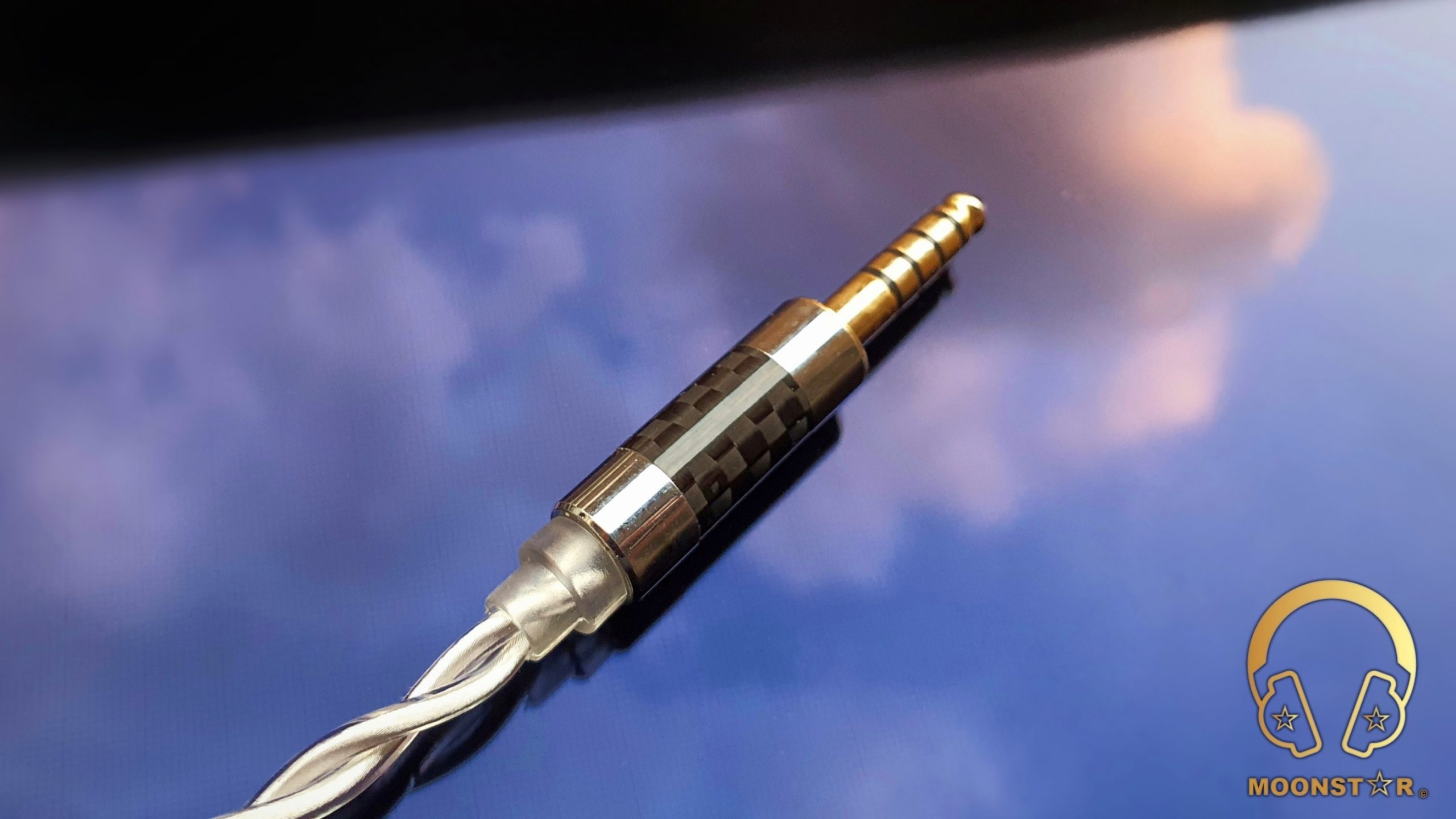 The detachable cable features a 4.4mm TRRRS Balanced (Pentaconn) headphone plug that has a straight profiled metal housing with a carbon fiber effect. Near the metal housing is a flexible transparent plastic strain relief for extra durability.