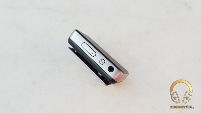 The frame of the ES100 is made of plastic in silver/light grey color. On the right side of this frame are the 2.5mm Balanced (TRRS) output the power button and next/previous track buttons.