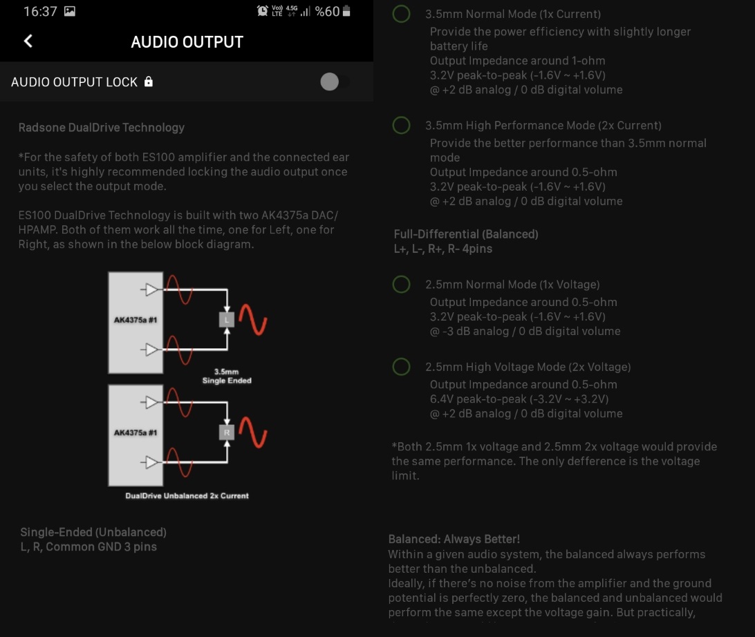 The Radsone ES100 (ES = EarStudio) has some nice features like 2 x AK4375a DAC’s, 3.5mm Unbalanced + 2.5mm Balanced output, LDAC, aptX-HD, AAC, aptX codec support, Independent Android/iOS App for custom fine tunings and more.
