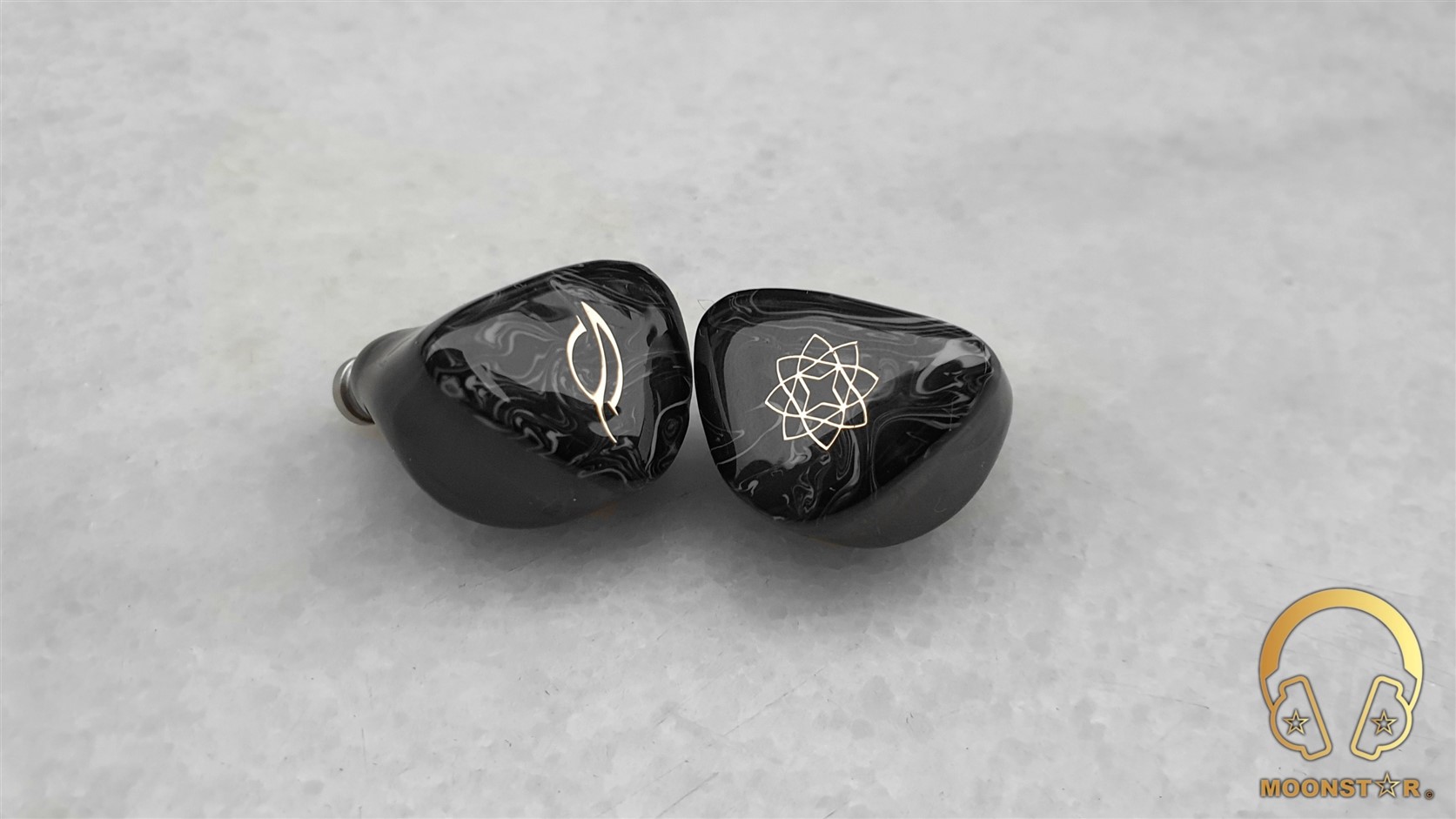 The right faceplate sports the SeeAudio brand logo, while the left earpieces has the special Bravery Lotus logo, which are both in a stylish gold color.