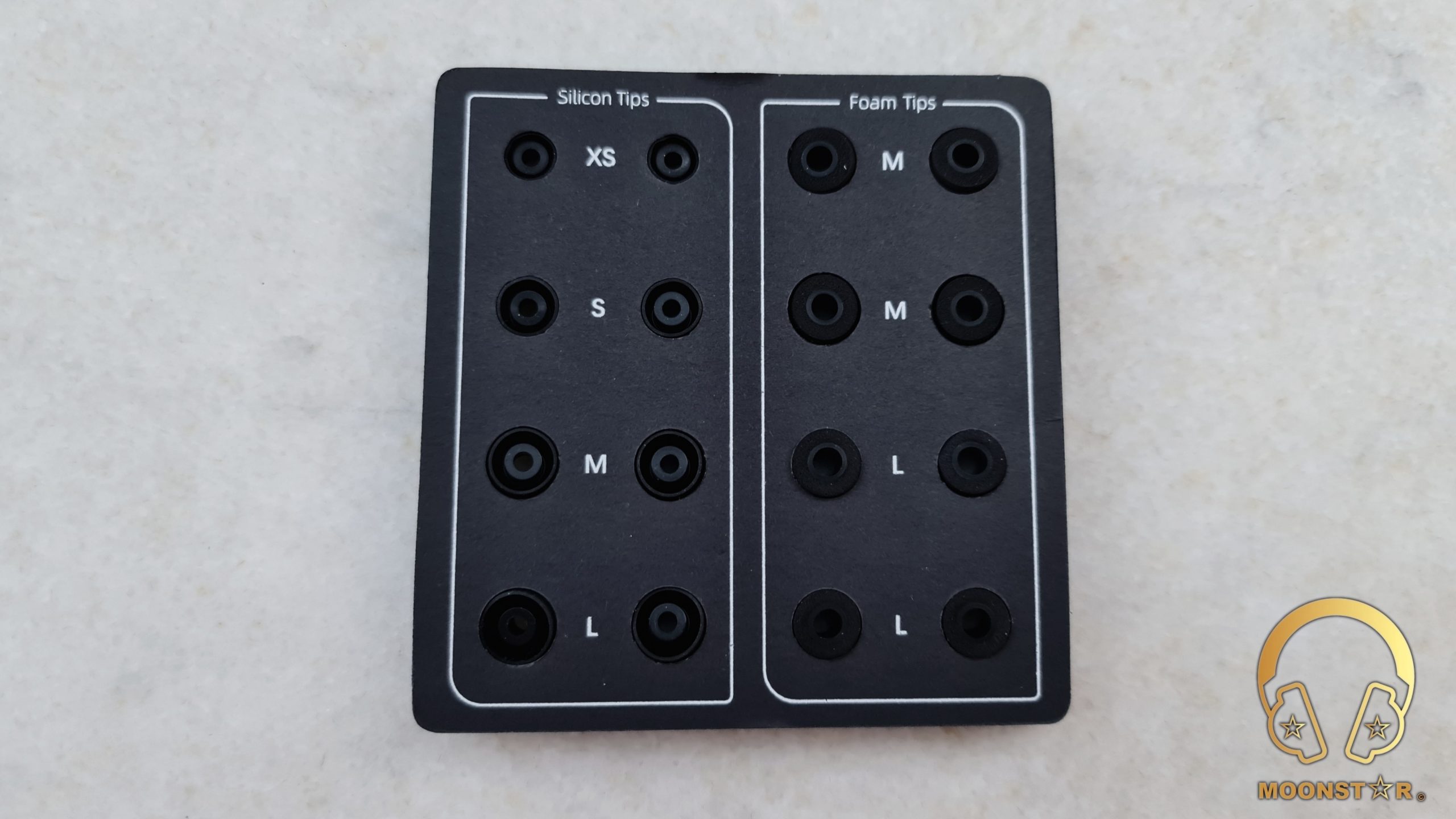 The YUME came with 4 pairs of silicone and 4 pairs of foam ear tips that are placed carefully in to a removable foam sheet.
