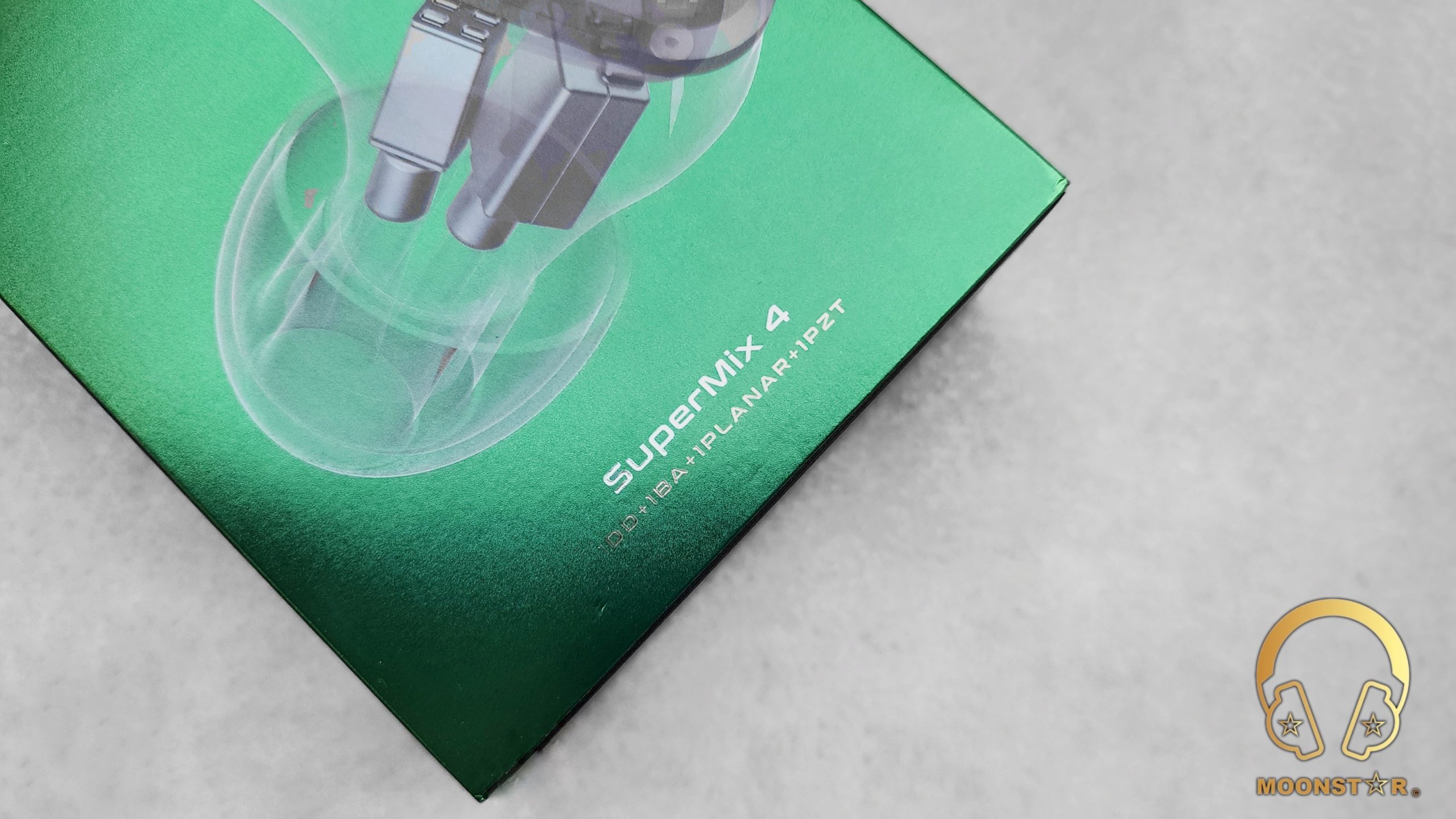 The SIMGOT SuperMix 4 is packaged in a relatively small black box enclosed by a green cardboard sleeve. The front of the sleeve showcases illustrations of the IEM’s internal components and some product related brandings, while the rear provides technical specifications and a frequency response graph of the product.