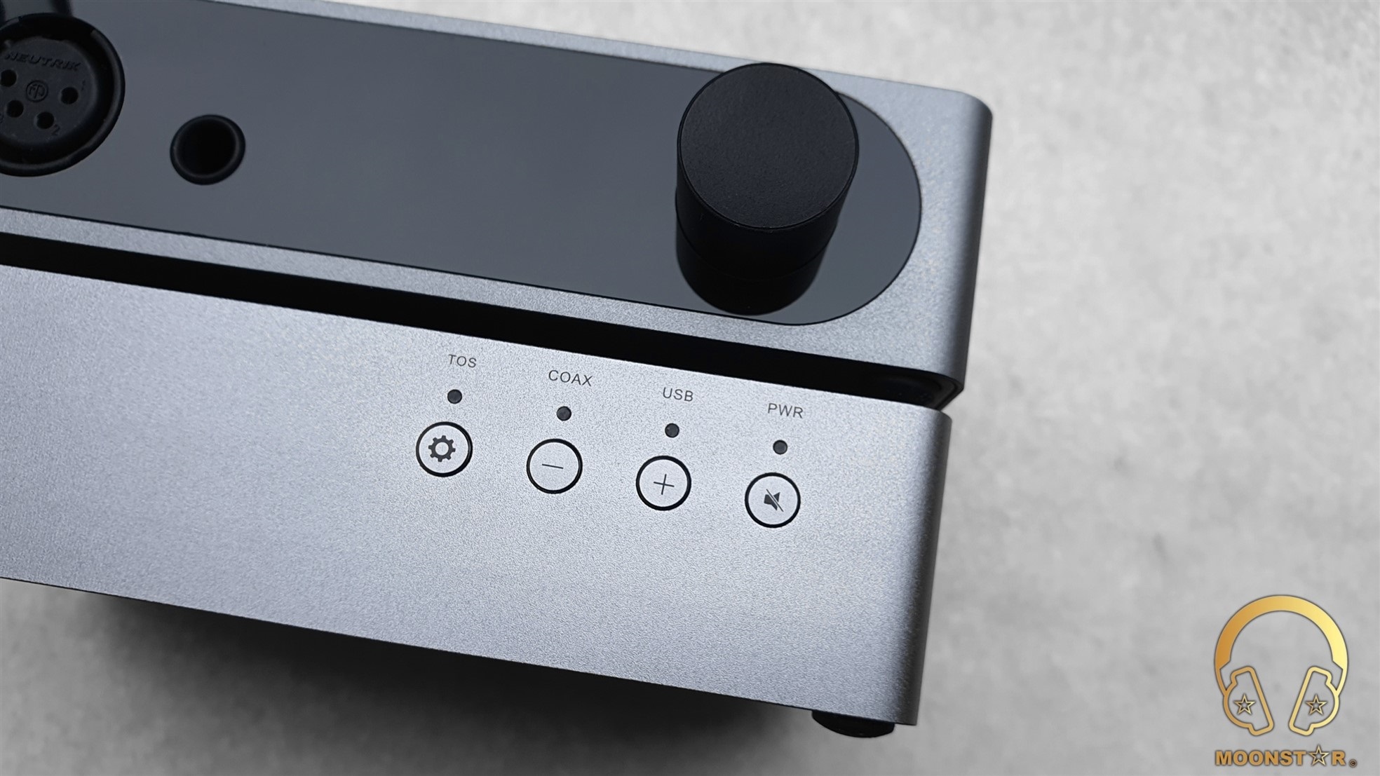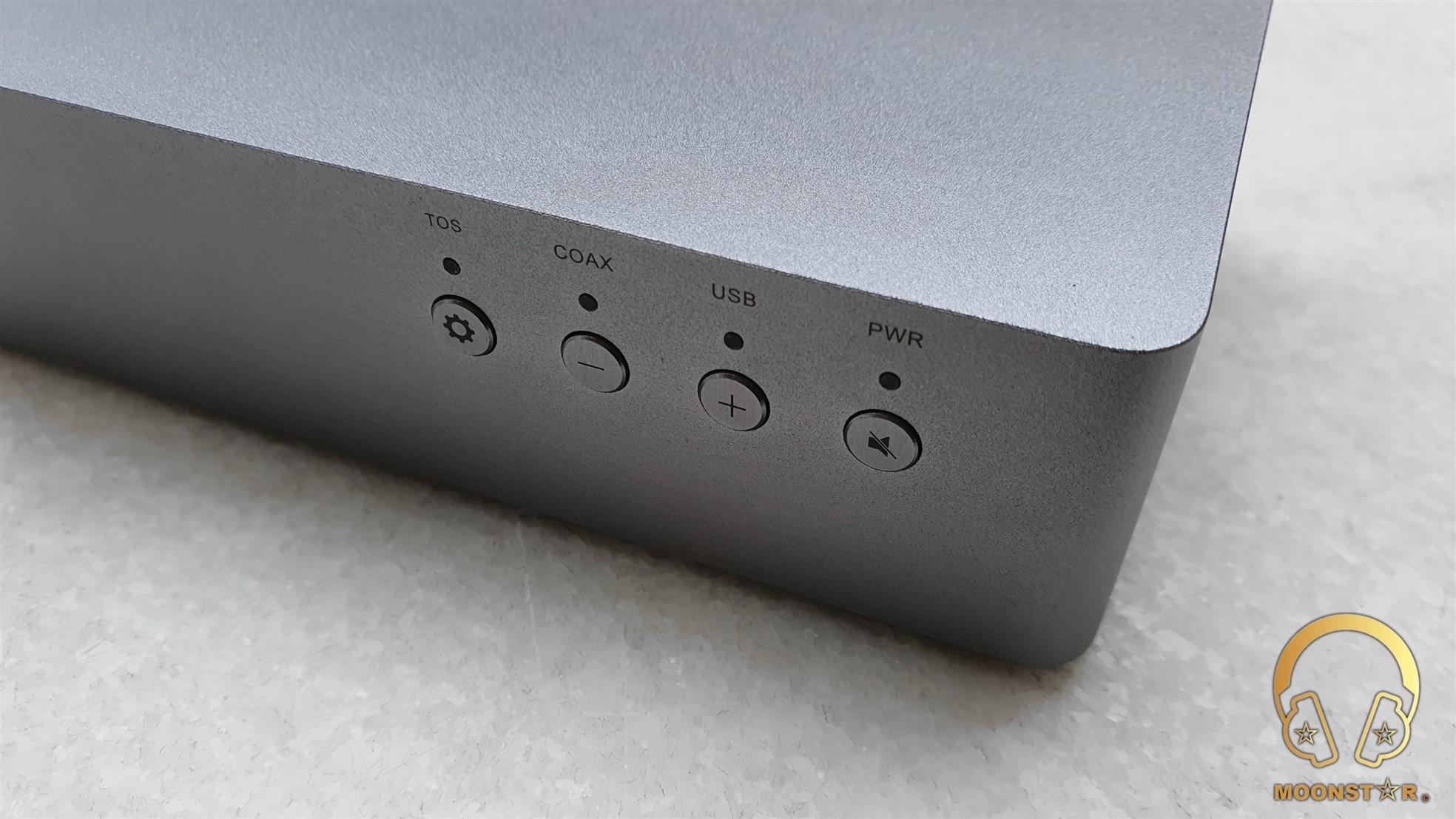 The front panel of the QXD1 sports four (4) multi functional hardware buttons, which are the TOS, COAX, USB and PWR (Power) buttons.