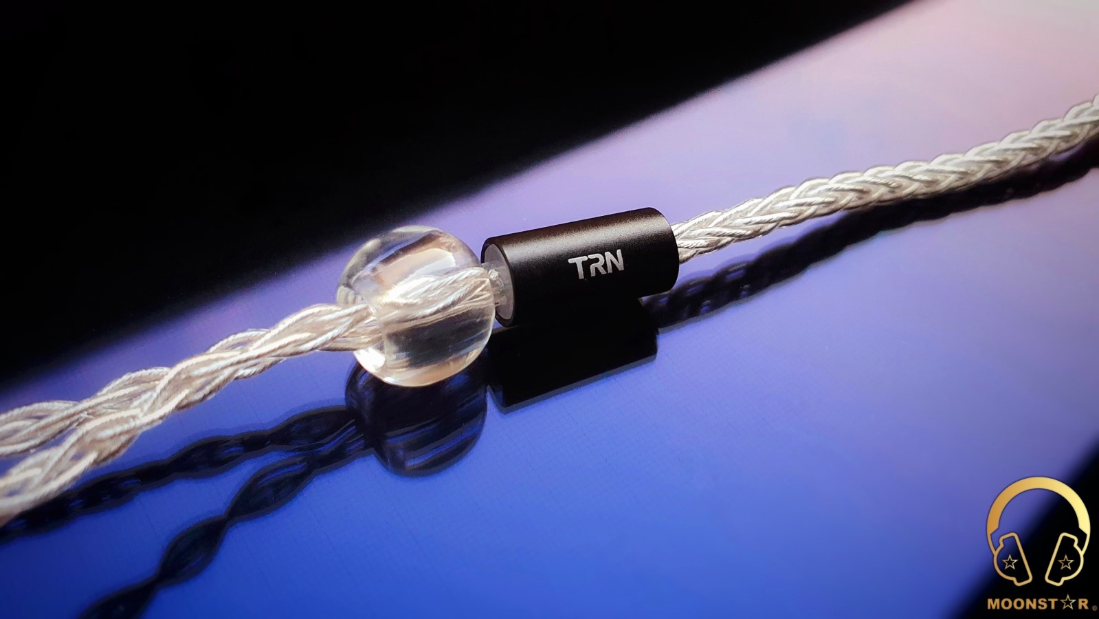 The detachable cable has a metal chin slider with the TRN brand logo on the top, and comes with a transparent plastic chin slider with a fancy shape rounded shape.