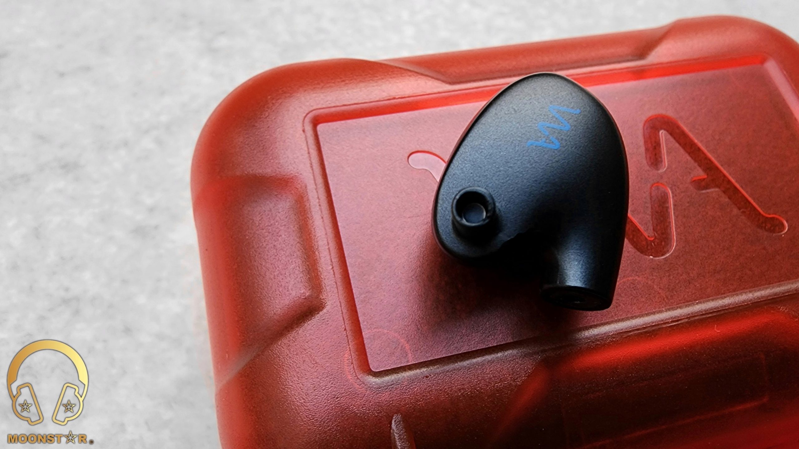 The rear surface of the monitor body features an approx 90 degree angled sound nozzle that has a diameter of about 2mm with the serial number on the top that are written with very small letters. The nozzle is relative long, which is a common design choice also used on previous models. The small disadvantage is the diameter of the nozzles, which makes the direct use of regular silicone or foam ear tips not possible. My solutions was to cute one pair of the Weston Audio STAR™ ear tips and use it like an adaptor that works quite good with many standard ear tips.