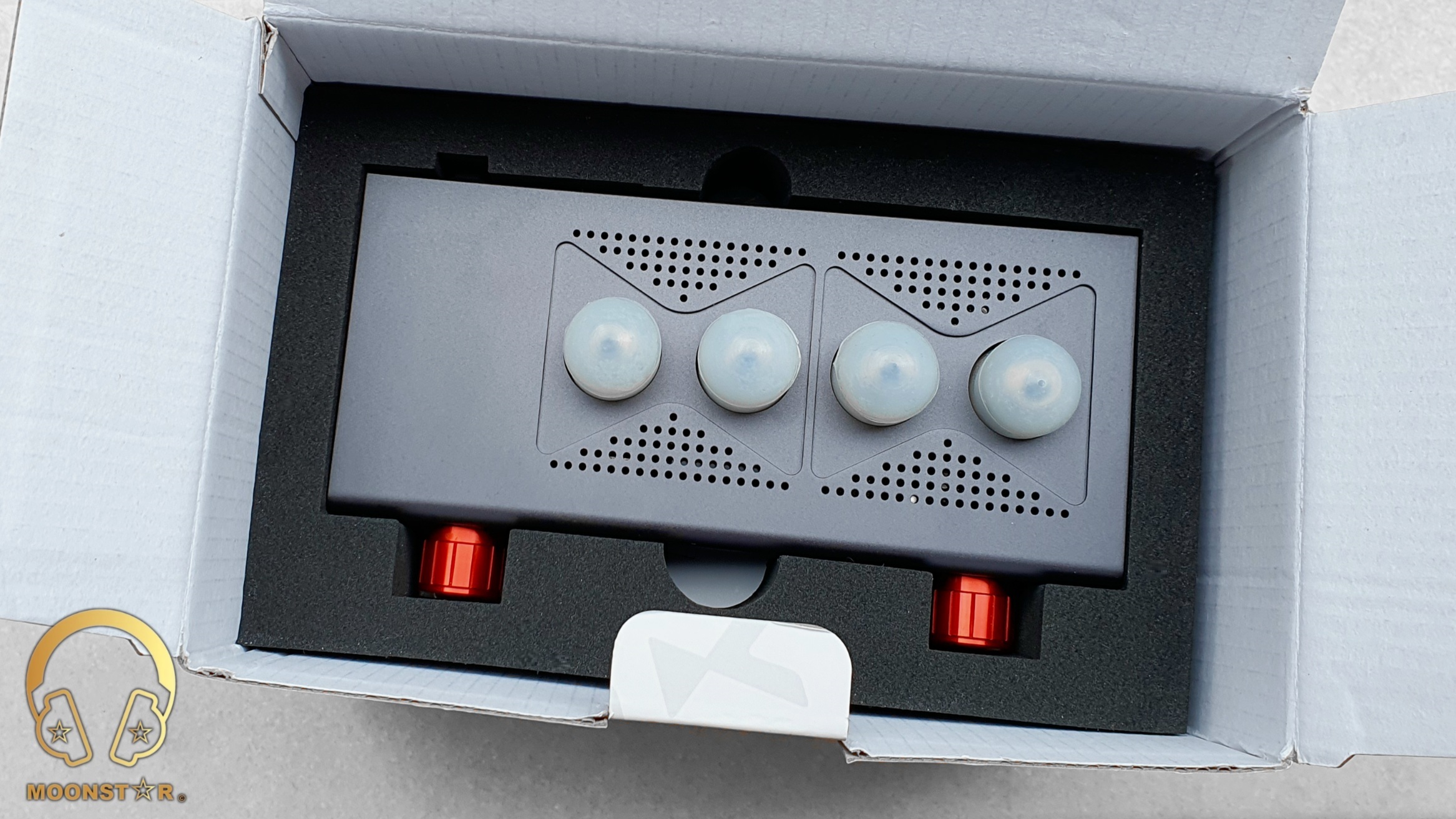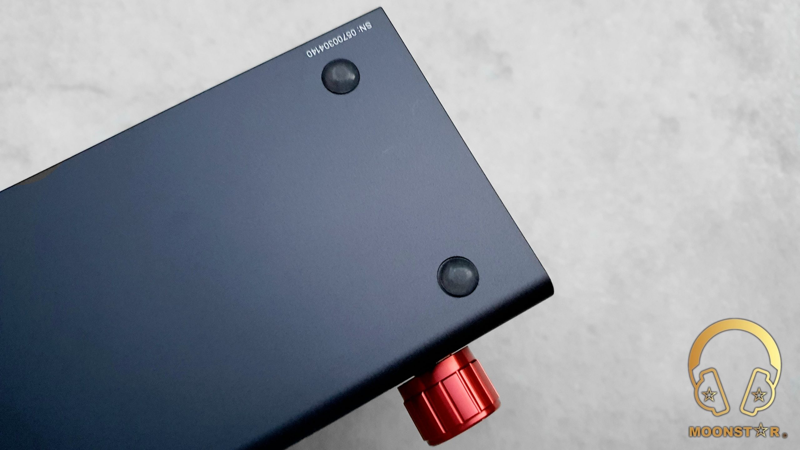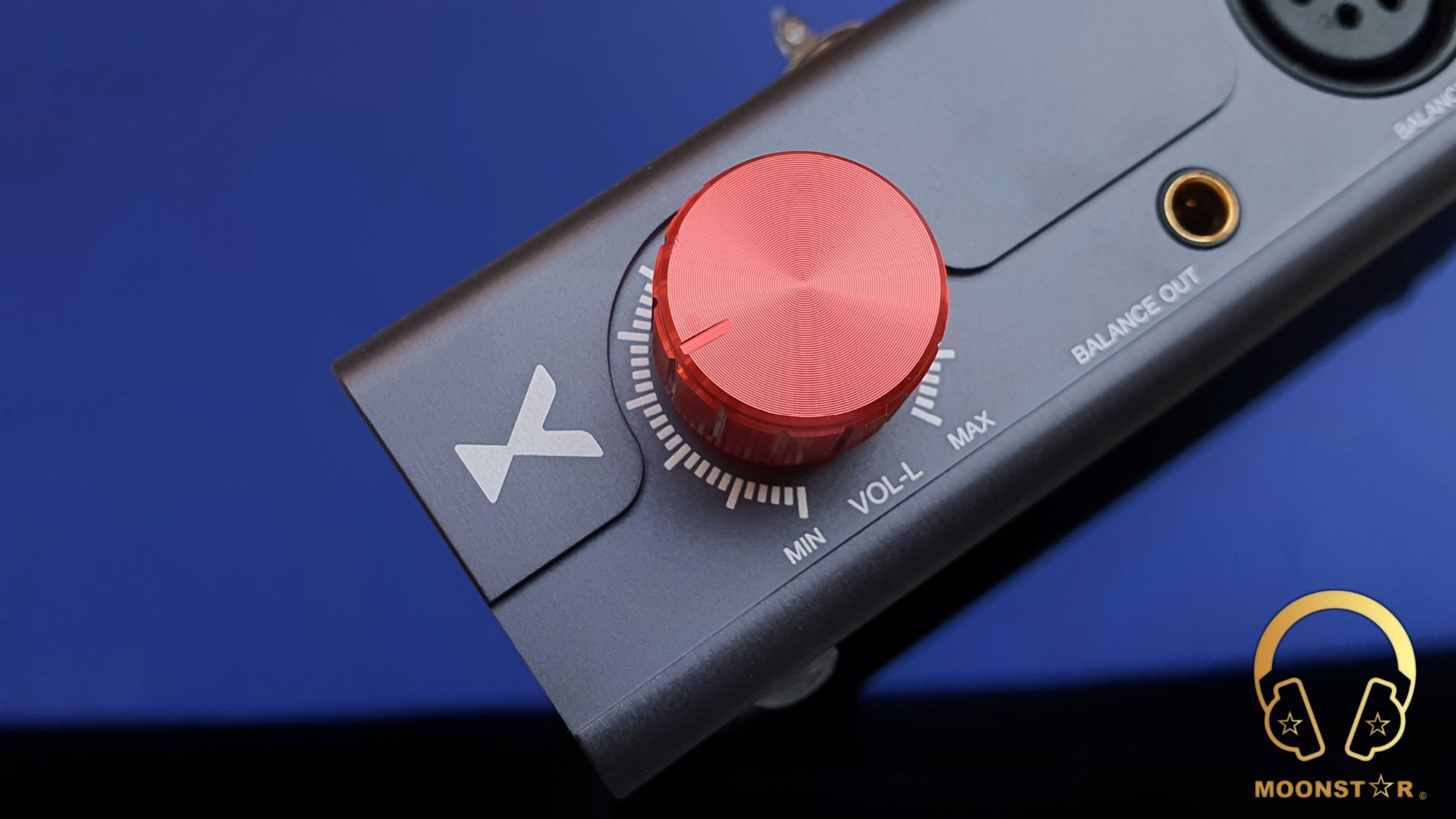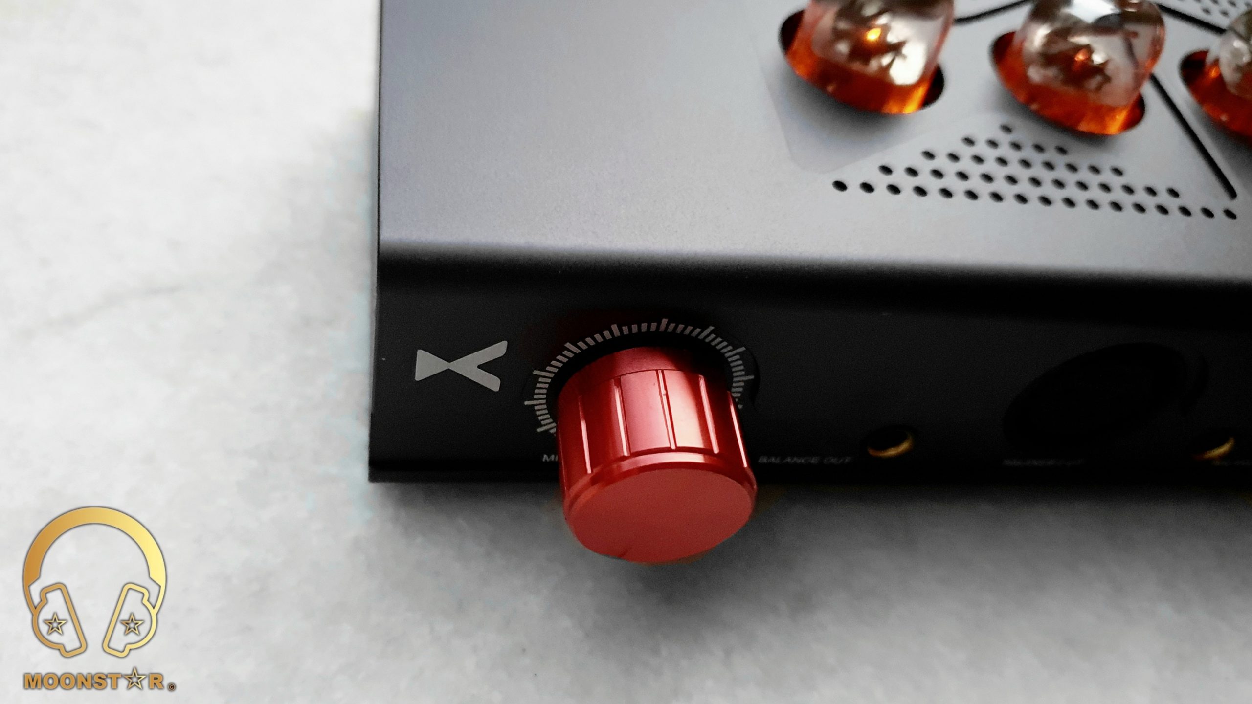 On the front of the device are the xDuoo brand logo and two volume wheels in a stylish red color, one for the left and one for the right cannel. My only complaint about the otherwise beautiful looking volume wheels is that the positions are not very easy to see. Here are also the 4.4mm Headphone Input and the XLR + 4.4mm Headphone Outputs with labels under each port.