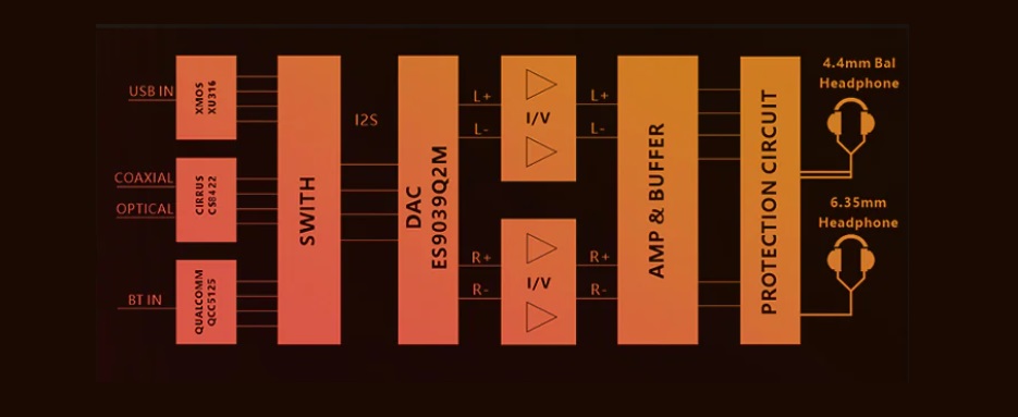 | 4.4mm BAL Headphone Output | Output Power: 2000mW (32Ω load), Frequency Response: 20Hz-60kHz (±0.5dB), Crosstalk: ≥118dB, SNR: 121dB (A-weighted), THD+N: 0.0004% |